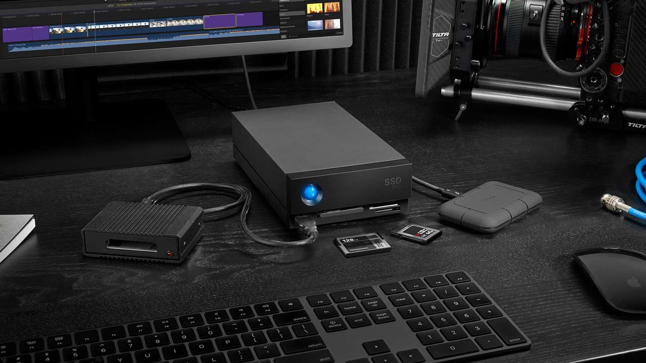 Das LaCie 1big Dock SSD Pro bietet, wie bei SSD-Medien zu erwarten, die höhere Datenrate aber weniger Speicherplatz. Mit einer Übertragungsgeschwindigkeit von 2.800 MB/s sollte es tatsächlich bei der Bearbeitung von 6K oder 8K-Videomaterial keine Probleme geben. Im Inneren arbeitet Es ist die FireCuda NVMe-SSD von der Konzernmutter Seagate. Hinzu kommen zwei USB-C-kompatible Thunderbolt 3-Anschlüsse, eine Docking-Station mit einem integrierten USB 3.0-Anschluss, Anschlüsse für Speicherkarten (CFast 2.0, CFexpress und SD) sowie ein DisplayPort 1.4-Ausgang. Damit hat man mit dem Anschluss von einem Kabel am Laptop eine deutlich erweitere Funktionalität bis hin zu einem weiteren Monitor. Allerdings gibt es den 1big Dock SSD Pro nur mit 2 oder 4 Terabyte, was bei sehr hochauflösendem Material dann doch recht schnell gefüllt ist.