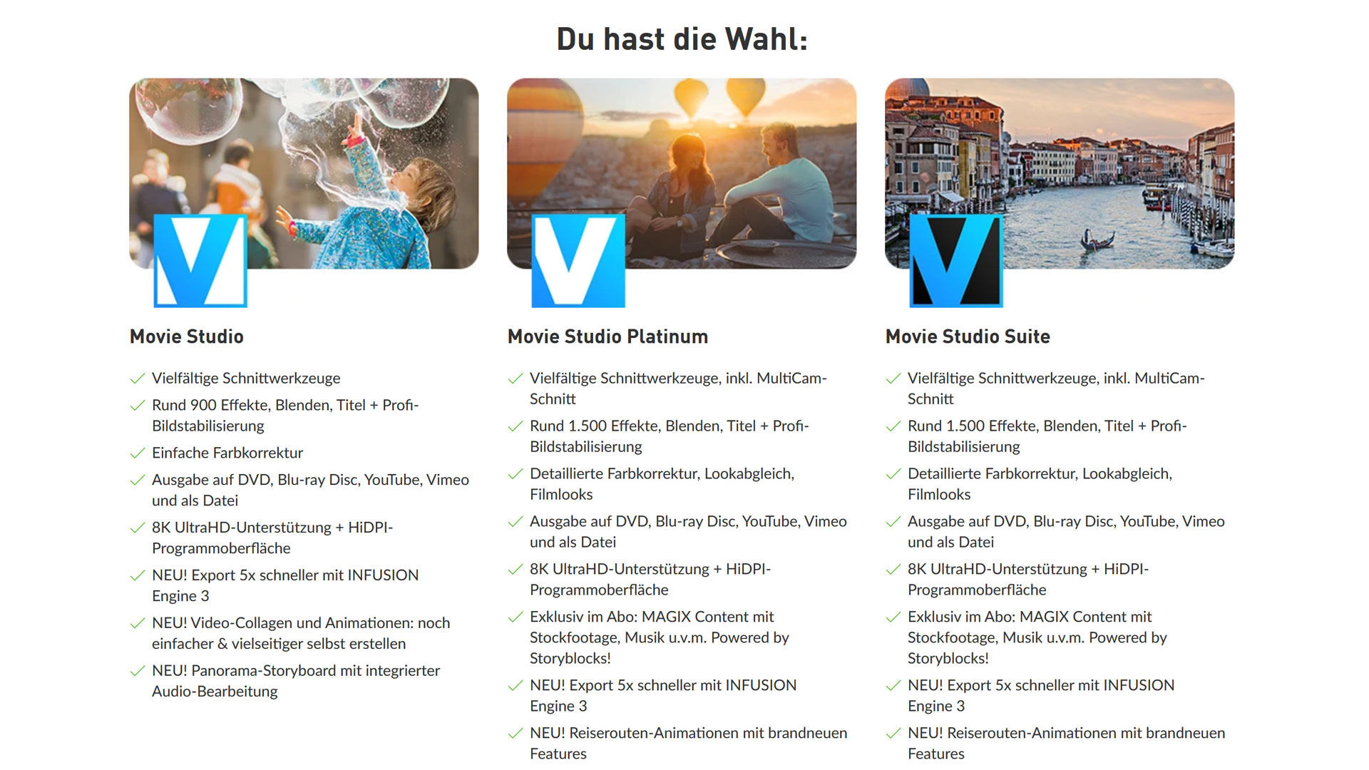 Allerdings ist auch auf der deutschen Website der Versionsvergleich ebenfalls derzeit statt mit Video deluxe mit Movie Studio betitelt. Für uns macht das schon fast den Eindruck, dass man auch hierzulande mittelfristig die Namensänderung vorbereitet. Zumal man in der Pressemitteilung auch von „Movie Studio wird vollständig ausgerollt“ spricht. Zugegeben das ist nur Spekulation - aber auf Dauer machen zwei Namen für das gleiche Programm keinen Sinn, denn dazu sind die Märkte inzwischen zu international. Und mit unserer Prognose, dass Magix nach dem Zukauf der Vegas Software auf Dauer nicht zwei Schnittprogramme für das gleiche Segment weiterentwickelt, lagen wir ja offensichtlich auch richtig. Zudem wird Video Pro X nun ebenfalls offensichtlich wieder dichter mit Magix Video deluxe/Movie Studio weiterentwickelt und vermarktet. Sie ist damit nun eher die große Version des Schnittprogramms. Schließlich hat Magix mit der Vegas-Schnittsoftware eine potente Profiklasse zu bieten. Apropos: Der zwischenzeitlich verwendete Markenname Movie Edit Pro wird nicht weiter genutzt.