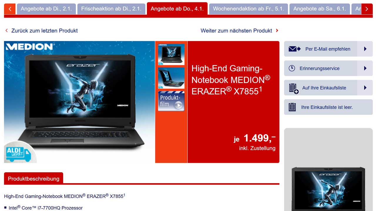 Kaufen kann man den Rechner bis 20. Januar bei Aldi Süd, wobei er nicht in den Filialen verfügbar ist. Man bekommt an den Kassen statt dessen einen Gutschein-Code, den man dann auf aldi-liefert.de zusammen mit seiner Adresse eingeben muss. Aldi liefert den Medion Erazer X7855 dann direkt nach Hause. Die Garantiezeit beträgt 3 Jahre.