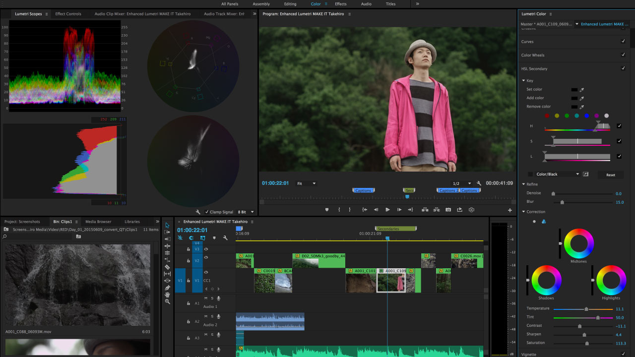 Die neuen Lumetrie Panels erweitern die Farbkorrektur von Premiere Pro CC um ein sekundäres HSL-Korrektur-Werkzeug. Damit kann man dann Elemente eines Objektes, etwa eine Jacke wie im Video zu sehen, einzeln bearbeiten und korrigieren. Einstellungen die man getroffen hat, lassen sich auf andere Clips übernehmen. Mit diversen Vorlagen stellt Adobe hier dann auch vorgefertigte Looks zur Direktanwahl bereit. Auch Material das in BT.2020 aufgenommen ist, kann man mit den Lumetrie Panels authentisch korrigieren, da der Farbraum direkt unterstützt wird.
