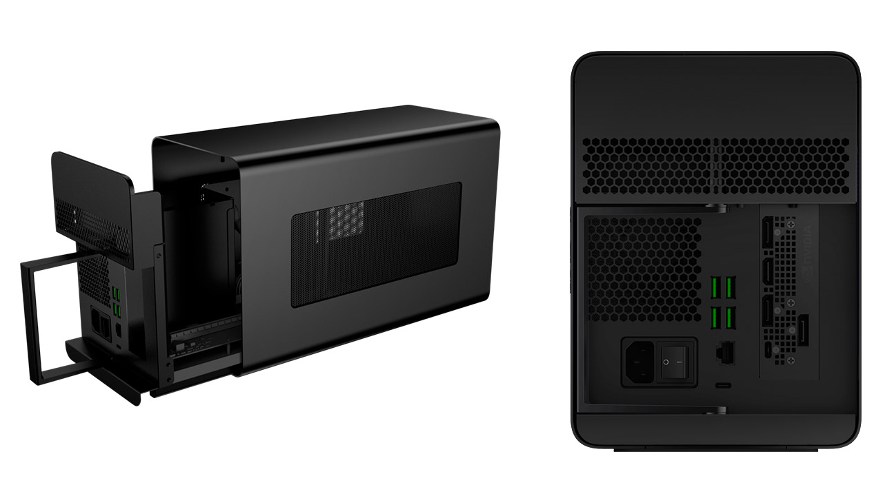 Das Gehäuse beinhaltet ein 700-Watt-Netzteil und wird per Thunderbolt 3 an kompatible Windows- wie Mac-Rechner angeschlossen. Als weitere Anschlussoptionen stellt das Core X Chroma vier USB 3.1 Typ-A-Anschlüsse bereit und kann auch noch mit einer Gigabit-Ethernet-Schnittstelle aufwarten. Über die USB-C-Buchse kann man dann auch direkt seinen Laptop mit Energie-Versorgen – maximal für bis zu 100 Watt. Die GPU darf maximal 500-Watt verbrauchen, unterstützt werden nahezu alle aktuellen GTX- und RTX-Modelle von Nvidia wie die RTX 2080 Ti, RTX 2080, RTX 2070 oder auch die RTX 2060. Aber auch die Nvidia Quadro P4000, P5000, P6000 oder GP100 darf man hier einsetzen.