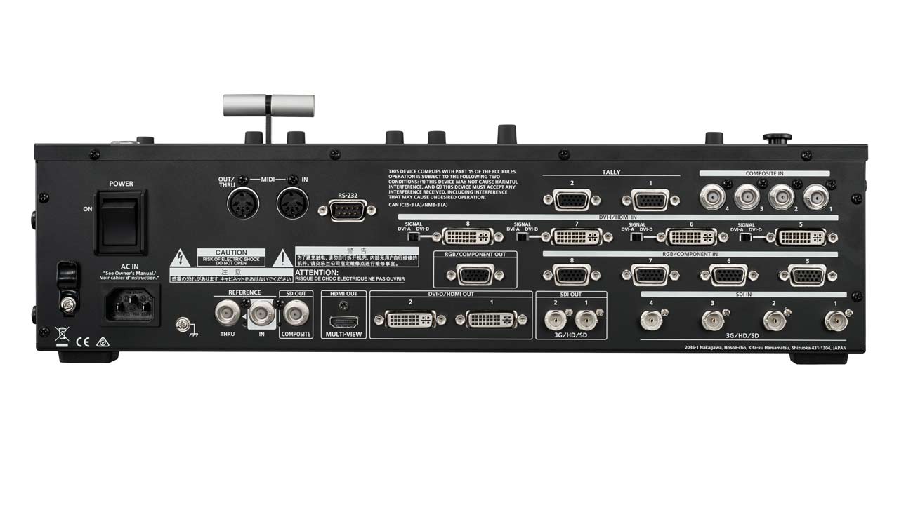Jeder Eingang des Roland V-800HD MK II ist mit einem Scaler ausgesattet, so dass man jeweils ganz unterschiedliche Signale anlegen kann. Entsprechend stehen an der Anschlussleiste nahezu alle Arten von digitalen und analogen Eingängen bereit. Der Scaler kann aber auch für eine virtuelle Zoomfahrt in das Videobild genutzt werden. Ausgangsseitig ermöglichen die internen Scaler die direkte Verbindung mit LED-Wänden, ohne auf externe Scaling-Lösungen zurückgreifen zu müssen. Wie inzwischen allgemein üblich gibt es einen HDMI-Multi-Viewer Ausgang, so dass man an einem Monitor alle Quellen gut überschauen kann. Den V-800HD MK II kann man über zwei weitere Kanäle mit Standbildern versorgen – zum einen via USB-Speicher oder über einen Frame Grab. Für die Kanaltaster gibt es zehn zuweisbare Video-Cross-Points.