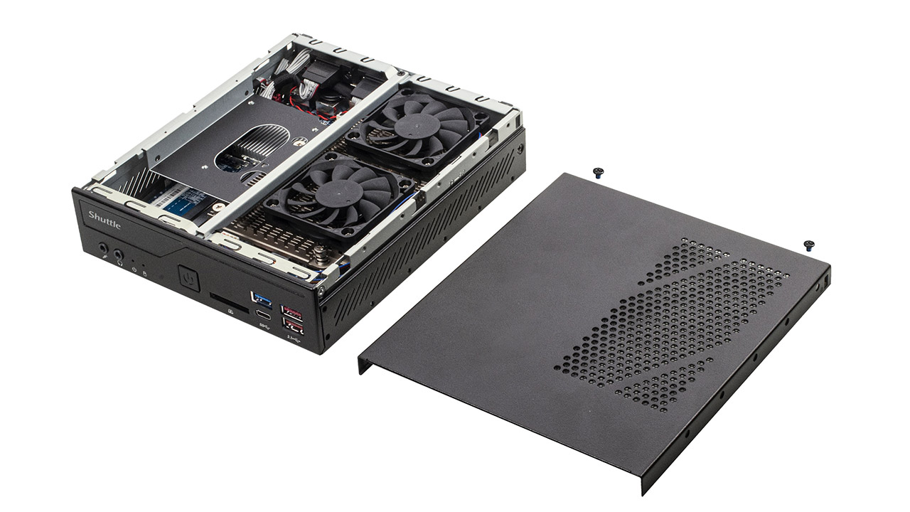 Für den Verbindungsaufbau mit dem Mobilfunknetz lässt sich anstatt eines 2,5-Zoll-Laufwerks auch ein 4G-Modem integrieren. Shuttle will mit dem XPC Barebone DH470 gerade auch professionellen Anwender ansprechen, etwa für Content Creation, Digital Signage, Serverdienste und die Industrie. Es gibt drei digitale Video-Ausgänge für HDMI 2.0 und zweimal DisplayPort. Diese unterstützen alle Bildschirme mit 4K-Auflösung und 60 Hz. Bei Verzicht auf einen der COM-Ports ist zudem noch ein optionaler analoger VGA-Ausgang machbar. Die kabelgebundene Netzwerkübertragung erfolgt über zwei Intel Gigabit Ethernet-Anschlüsse auf der Rückseite. Außerdem vorhanden gibt es viermal USB 3.2 Gen 2 (10 Gbit) und viermal USB 3.2 Gen 1 (1× Typ-C, 5 Gbit) plus zwei COM-Ports und einen Remote-Power-On-Anschluss zum Fernstart des Rechners. Der SD-Kartenleser ist direkt an der Vorderseite angebracht.