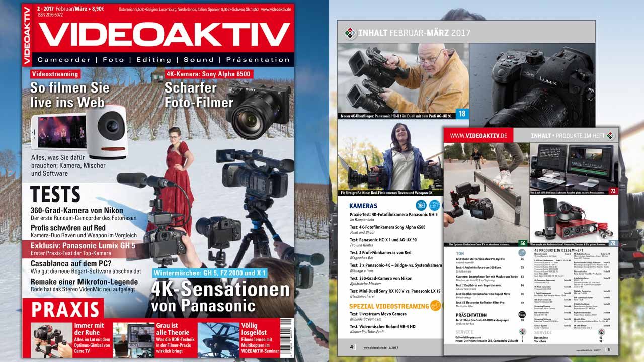 UPDATE: 3x VIDEOAKTIV 01/2017 zu gewinnen - Starke 72 Tests für Filmer auf satten 193 Seiten! Darunter 28 Camcorder, drei Videodrohnen, vier 360-Grad-Kameras, neun filmende Fotokameras und acht Videoschnitt-Pakete: Der neue KAMERA KAUFBERATER 2017 liefert alle Informationen, die man zum Filmen über das Jahr 2016 hinein ins Jahr 2017 braucht und behandelt alle neuen Filmertrends.