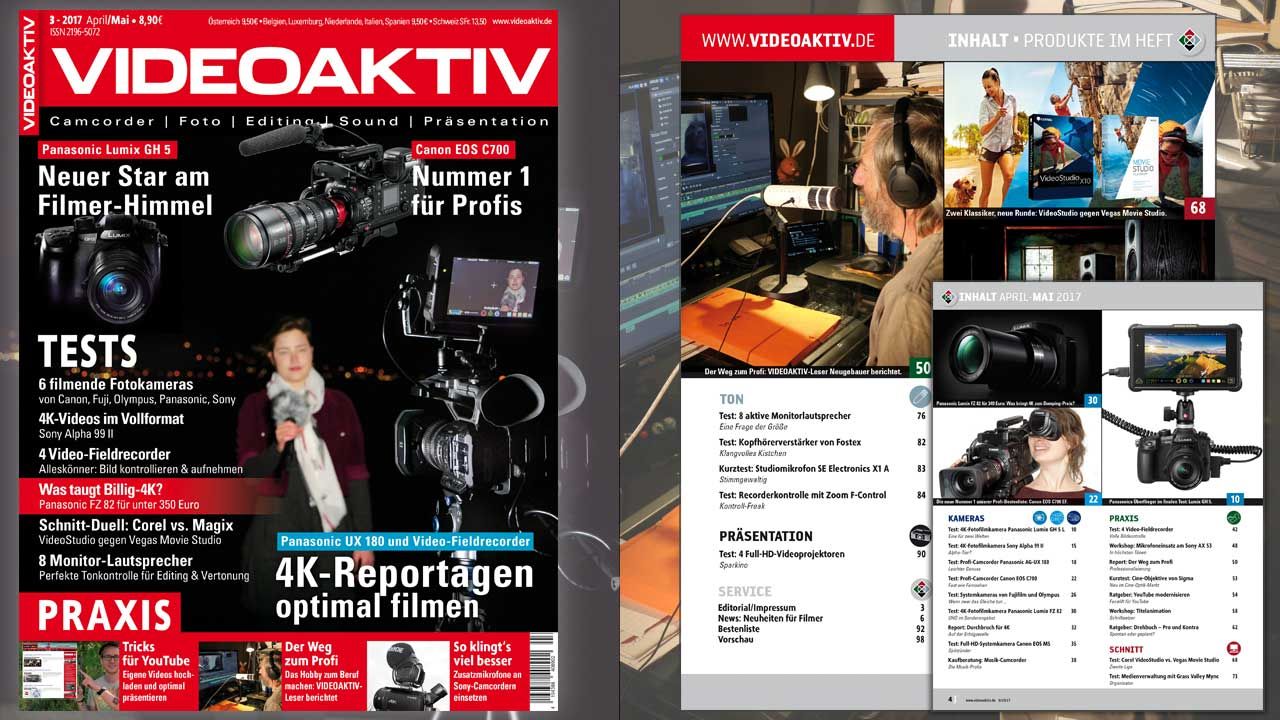 Die neue VIDEOAKTIV 3/2017 ist ab sofort digital zu haben sowie vorbestellbar – im Test natürlich die Panasonic GH5, jetzt mit Messwerten und Testtabelle. Daneben gibt