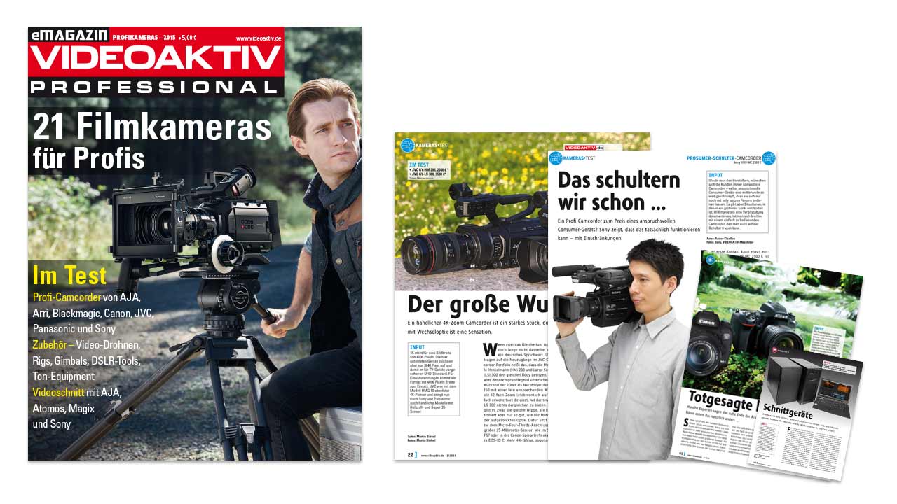 Mit dem eMagazin liefern wir die Tests von allen wichtigen Profi-Camcordern und viel Equipment für Produktion und Nachbearbeitung. Ab sofort für nur 5 Euro als PDF zum Download.