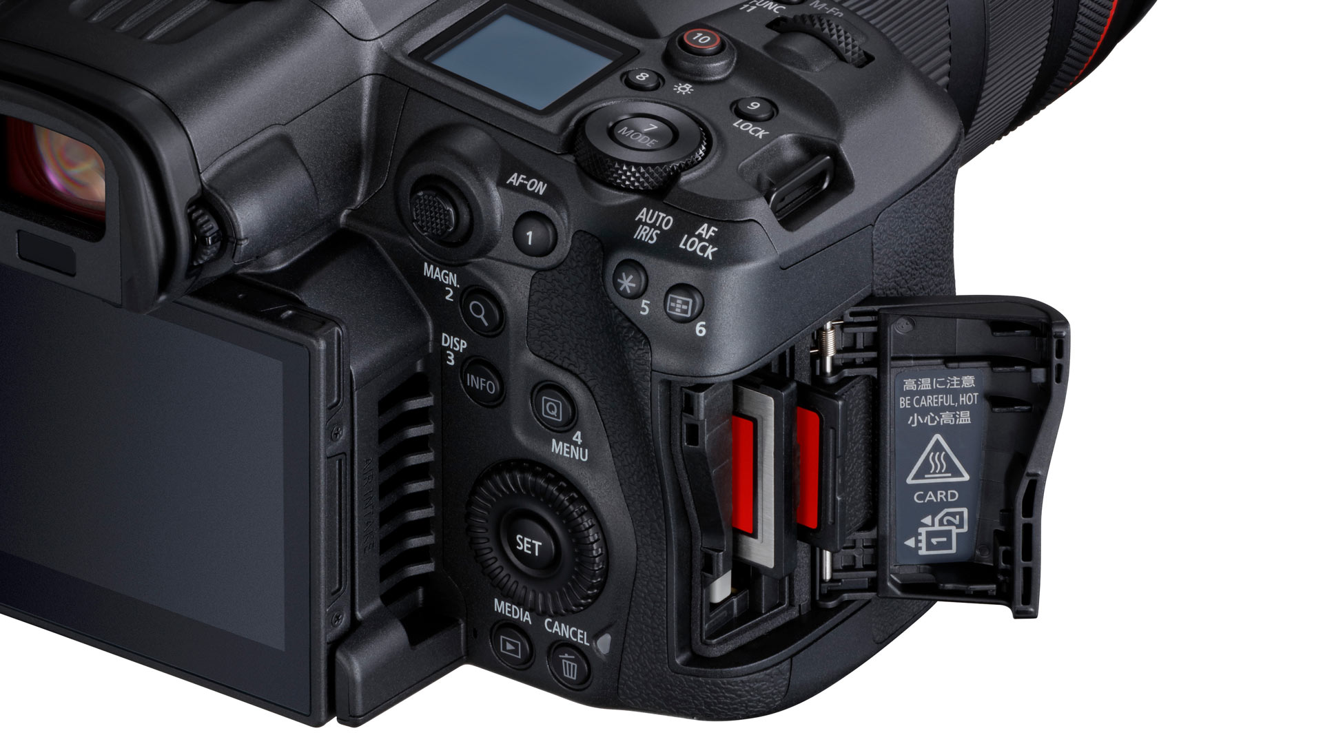 Wahlweise zeichnet die EOS R5 C auf CFexpress 2.0 Typ B oder auf SDXC-Speicherkarten auf. Die Tasten sind, bis auf ein Umschalter zwischen Foto- und Videofunktion (auf der linken Gehäuseseite), ansonsten identisch mit der EOS R5.