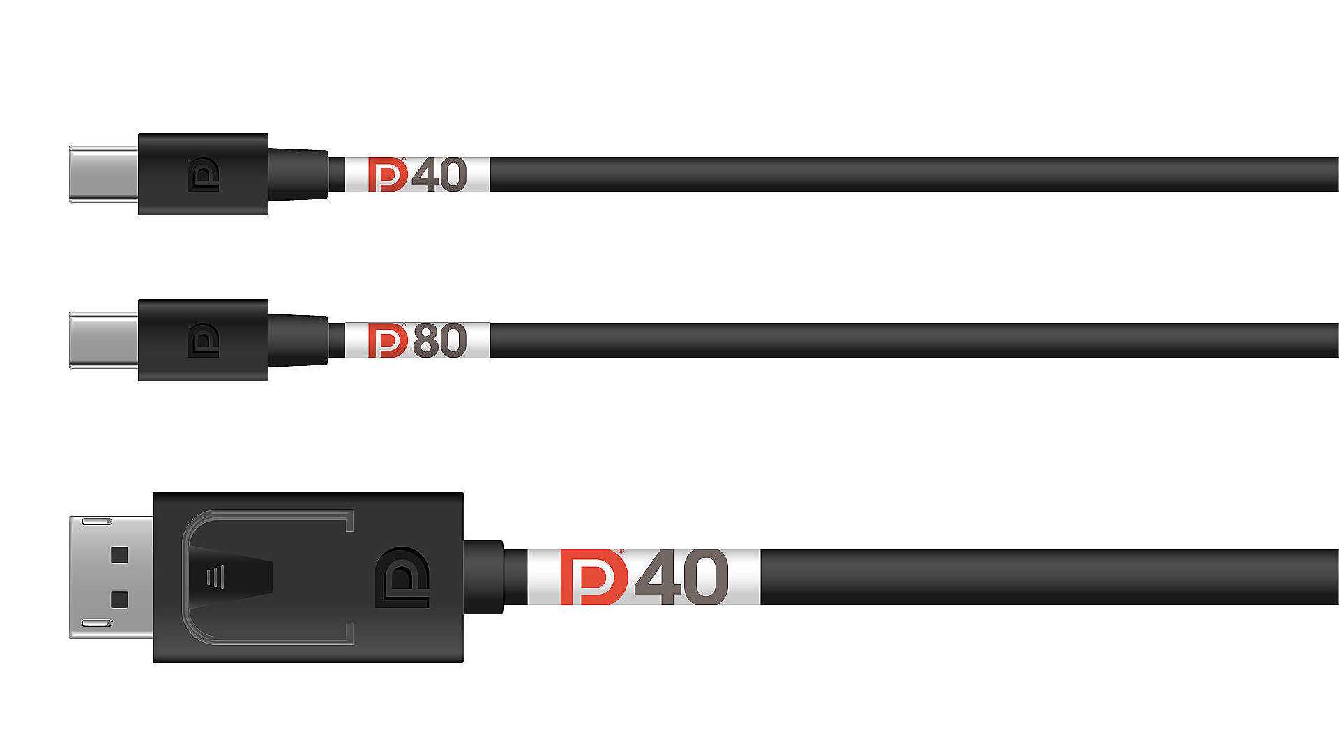 Mit DisplayPort 2.0 wird es auch neue Kabel geben, mit kleinen und großen Buchsen. DP40 überträgt dabei maximal 40 Gbit/s - DP80 bis zu 80 Gbit/s.