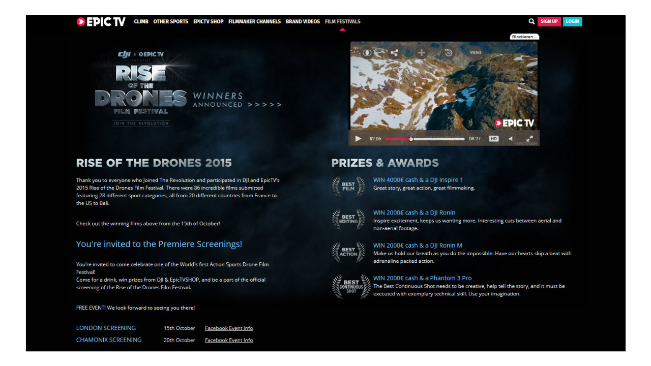 Zweites Festival in Kooperation mit Epic TV ist das Rise of the Drones Festival, welches bereits im letzten Jahr stattgefunden hat und dort (laut DJI) mehr als eine Millionen Videoaufrufe erreichte. Das Festival richtet sich an „mutige“ Outdoor-Filmer, die spektakuläre Action-Sport- und Outdoor-Filmaufnahmen aus der Luft präsentieren wollen. Einsendungen sind hier bis zum 19. Juni möglich. Diese werden von einer „Experten-Jury“, unter anderem bestehend aus dem Executive Producer von EpicTV, Alan Sim, DJI Studio Manager, Ferdinand Wolf, und DJI European Marketing Direktor, Martin Brandenburg bewertet. In insgesamt vier Kategorien wird je ein Gewinner für Bester Film, Bestes Editing, Beste Action und Beste zusammenhängende Aufnahme gekürt. Die Gewinner der Kategorie „Bester Film“ erhalten einen DJI Inspire 1 Pro und 2.000 Euro. Termine und weitere Informationen sollen in Kürze bekannt gegeben werden. Alle Infos findet man dann hier.