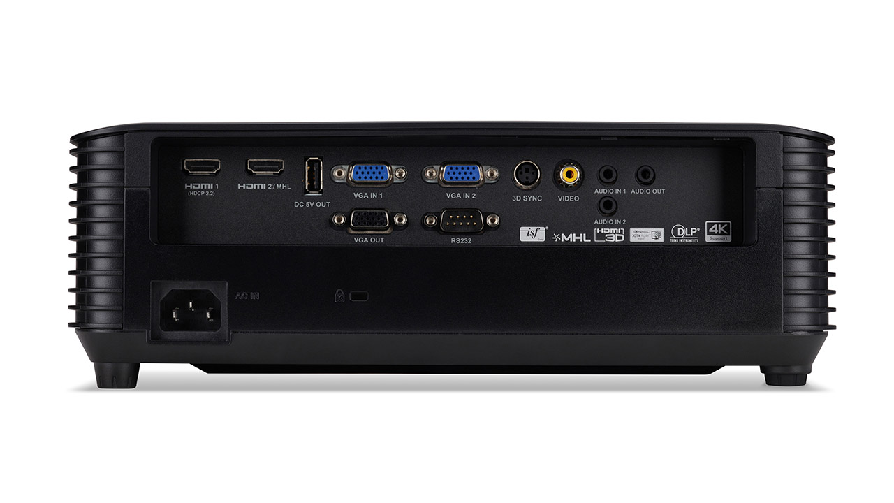 Die Anschlussleiste stellt einmal HDMI 2.0 sowie einmal HDMI 1.4 (MHL-fähig) bereit. Dazu gibt es zwei VGA- sowie ein Composite-Buchse und eine Audio-Ein- und Ausgang via 3,5 Millimeter Klinke. Die direkte Tonwiedergabe gelingt über den integrierten 10-Watt-Lautsprecher. Die Betriebslautstärke gibt Acer mit 31 Dezibel für den hellsten Bildmodus an, was noch im ordentlichen Bereich liegen dürfte, allerdings schon deutlich hörbar ist. Da „hören“ sich die 23 Dezibel im Eco-Modus schon besser an. Die Bildhelligkeit fällt hier dann allerdings auch auf 1760 ANSI-Lumen. Bei der Lampenlebensdauer macht der Hersteller Angaben zwischen 3500 und 12.000 Stunden je nach Lampenmodus.