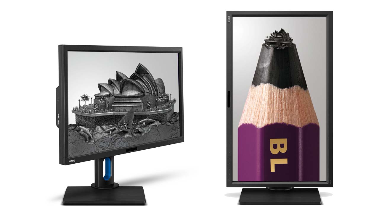 Mittels Display-Pilot-Software lassen sich Inhalte von zwei unterschiedlichen Quellen nebeneinander anzeigen. BenQ achtet zudem auf Ergonomität: Der BL2711U lässt sich um 45 Grad nach rechts und links drehen sowie um -5 Grad nach vorne und +20 Grad nach hinten neigen. Den Standfuß kann man bis zu 14 Zentimeter nach oben ausziehen. Gerade für Grafiker ist zudem die Pivot-Funktion interessant, womit sich das komplette Display um 90 Grad hochkant stellen lässt.