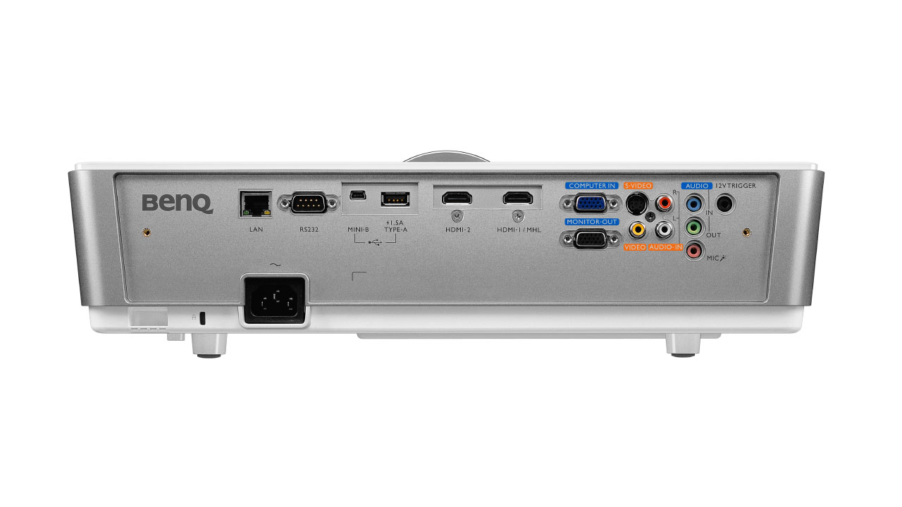 Die Anschlussleiste beherbergt zwei HDMI-Buchsen wovon eine MHL-fähig ist und somit auch mit Smartphones und Tablets kommuniziert. Dazu gesellt sich eine VGA-, S-Video- und Composite-Schnittstelle. Ob man über die integrierte USB-Schnittstell direkt Videoformate einspielen kann, wird aus den technischen Daten nicht klar. Über einen optionalen „Qcast Dongle“, der in die HDMI-Schnittstelle gesteckt wird, kann man Inhalte von Laptop, Smartphone oder Tablet mit Hilfe der BenQ QCast App dann auch kabellos an den Projektor schicken.