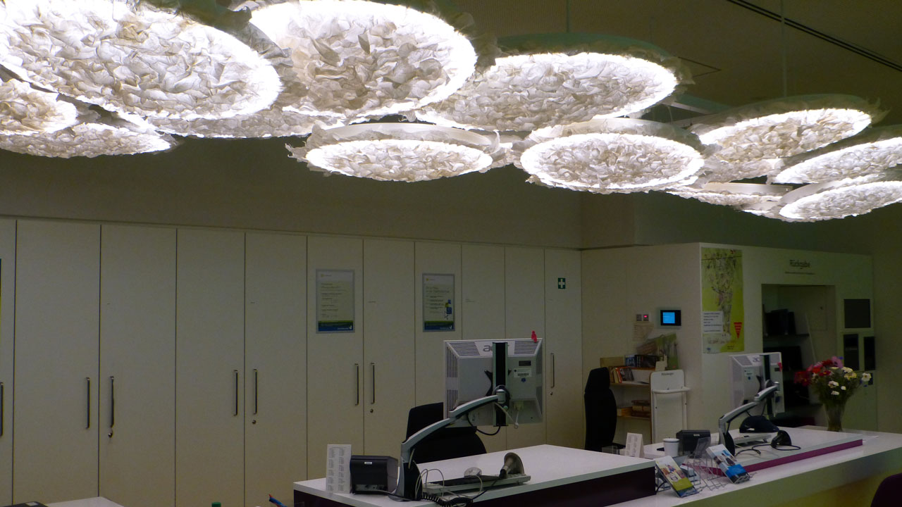 Um Schallreflektionen zu verringern und es im Raum merklich leiser werden zu lassen, sind großformatige Schallabsorber-Bilder oder -Objekte eine Lösung. Die Bilder und Raumskulpturen von BergerLine nehmen Schall auf und reduzieren den lästigen Nachhall im Raum deutlich. Gleichzeitig sind sie als Kunstwerke individuell angefertigte Unikate, die Räumen ein besonderes Flair verleihen. In besonders großen und hohen Räumen ist neben den Wänden auch die Decke als Reflektionsfläche für den Schall relevant. In solchen Fällen kreiert BergerLine Skulpturen aus mehreren Einzelelementen, die unter der Decke zu schweben scheinen. Kombiniert mit LED-Leuchten werden sie zum unverwechselbaren Licht-Objekt. Für Kunden, die mit farbigen Licht-Effekten spielen möchten, integriert BergerLine Lichttechnik, die – vom Tablet-Computer aus angesteuert – wahlweise auch in rot, blau oder grün erstrahlt.