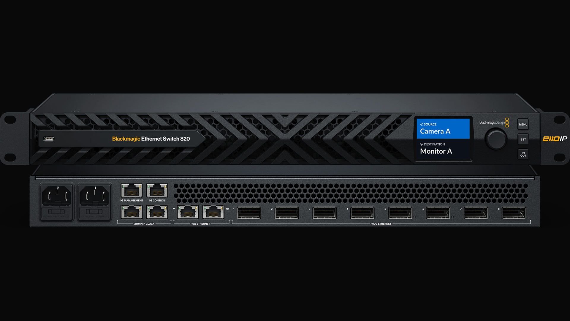 Für die Integration von 12G-SDI-Komponenten in SMPTE-2110-Setups ist der SDI Expander 8x12G (3.205 Euro) zuständig, welcher mit jeweils acht 12G-SDI-Anschlüssen für Eingangs- und Ausgangssignale insgesamt 16 Wandlerkanäle auf oder von den beiden 100G 2110 IP Video-Anschlüssen bereithält. Letztere Anschlüsse besitzt auch der UpDownCross 100G (2.589 Euro), welcher simultan bis zu acht SD, HD oder UHD-Signale in andere Standards konvertieren kann. Als Mischer für SMPTE-2110-Setups fungiert der neue Ethernet Switch 820 (2.465 Euro), welcher acht 100G- und zwei 10G-Ethernet-Anschlüsse besitzt. Blackmagic wirbt mit zwei redundanten PTP Clock-Ports sowie einer auf wenig Lautstärke ausgelegter Kühlstruktur.