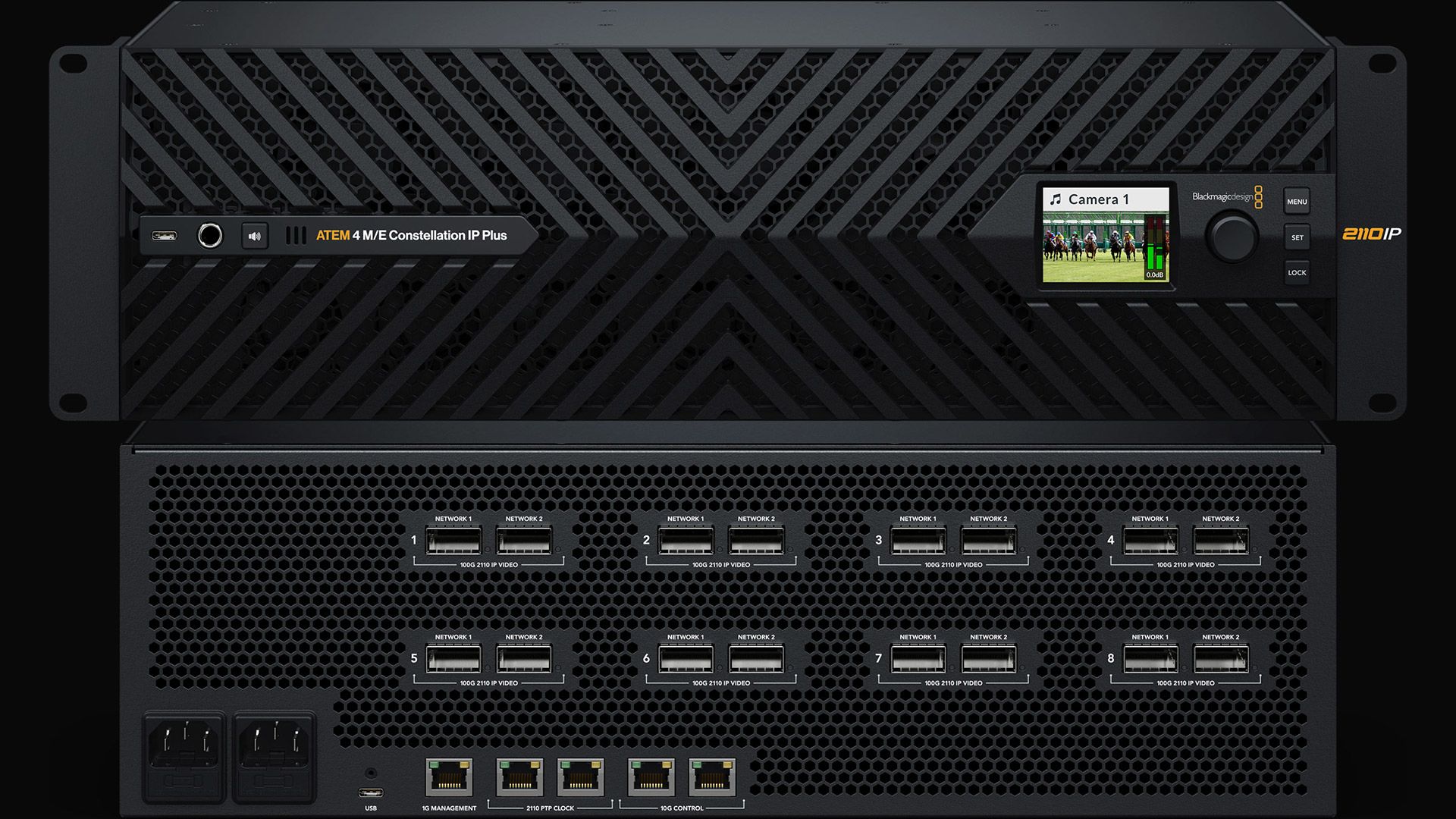 ATEM 4 M/E Constellation IP und ATEM 4 M/E Constellation IP Plus sind ebenfalls Mischer mit zueinander redundanten 100G-Ethernet-Anschlüsse, wobei das Plus-Gerät mit acht Eingängen doppelt so viele Möglichkeiten bietet wie die Standard-Variante. Damit stehen natürlich auch doppelt so viele Ein- und Ausgänge zur Verfügung (64 in und 52 out zu 32 in und 28 out). Gleichheit herrscht bei den 16 ATEM Advanced Keyers, vier Multi-View-Modi und zwei SuperSource-Prozessoren. Weder Ethernet Switch 820 noch die Constellation IP-Modelle besitzen die für Mischer typischen Kamera-Auswähltasten. Hier springen die neuen ATEM Monitoring Rack Panel 20 und 40 ein, welche 20 respektive 40 dieser Tasten besitzen. Konnektivität wird mittels 10G 2110 IP Video-Anschlüssen sichergestellt, zudem bieten die Rack-Paneele Talkback und eine Liveübersicht mittels integriertem Bildschirm.