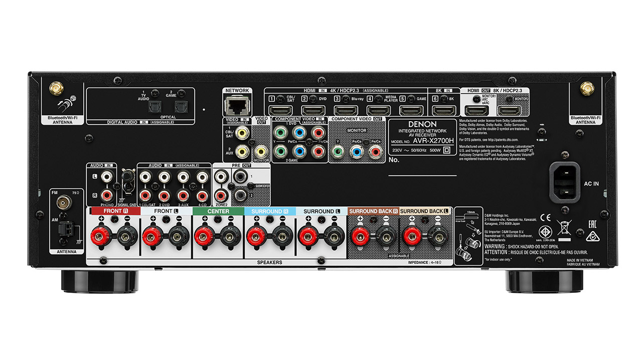 Die neue X-Serie von Denon bietet wie gewohnt umfangreiche Anschluss-Optionen. Darunter beim AVR-2700H unter anderem sechs HDMI-Eingänge und zwei -Ausgänge.