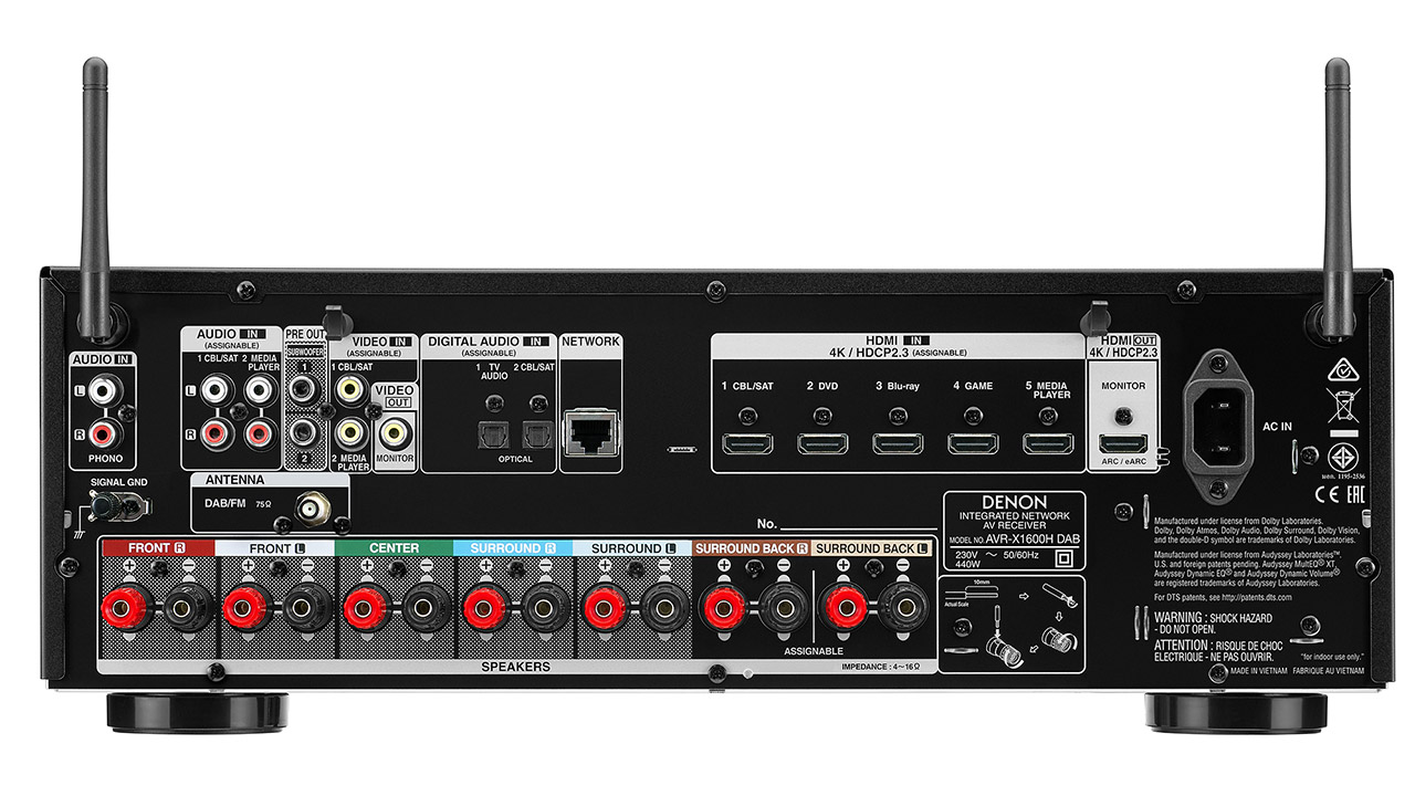 Der AV-Receiver liefert eine Ausgangsleistung von 145 Watt pro Kanal und unterstützt Dolby True HD und DTS HD Master Audio sowie Dolby Atmos, DTS:X und die Erweiterung von DTS-kodierten Inhalten auf DTS Virtual:X. Auch die Dekodierung der verlustfreien Formate ALAC (bis zu 24 Bit/192 kHz), FLAC und WAV sowie DSD (2,8 und 5,6 MHz) unterstützt er. Der Denon AVR-X1600H DAB versteht den aktuellsten Kopierschutz für HDCP 2.3, womit es kein Problem ist ein entsprechendes Videosignal durchzuschleifen. Daneben ist er zu einer 4:4:4 Farbabtastung kompatibel und versteht BT.2020, HDR10 (High Dynamic Range), Dolby Vision sowie HLG (Hybrid Log-Gamma). Via 4K-Ultra HD HDMI (6 Eingänge, 1 Ausgang) und aufgrund der HDCP 2.3-Unterstützung an sämtlichen Ports kann der AV-Receiver der X-Serie mit aktuellen 4K- und den kommenden 8K-TV-Geräten als auch mit Streaminggeräten, Spielkonsolen oder anderen Quellen kommunizieren.