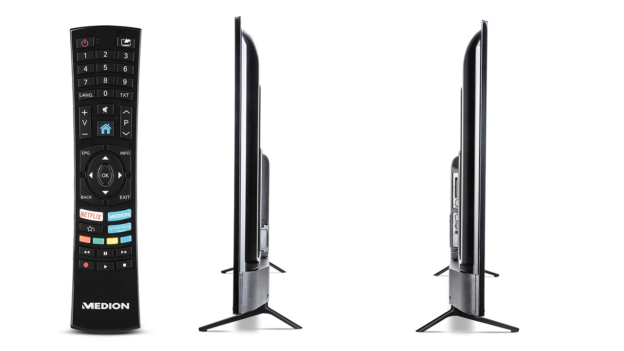 Anschlüsse offeriert der Medion unter anderem für viermal HDMI 2.0. Alternativ zur Fernbedienung kann man auch das Smartphone zur TV-Steuerung nutzen.