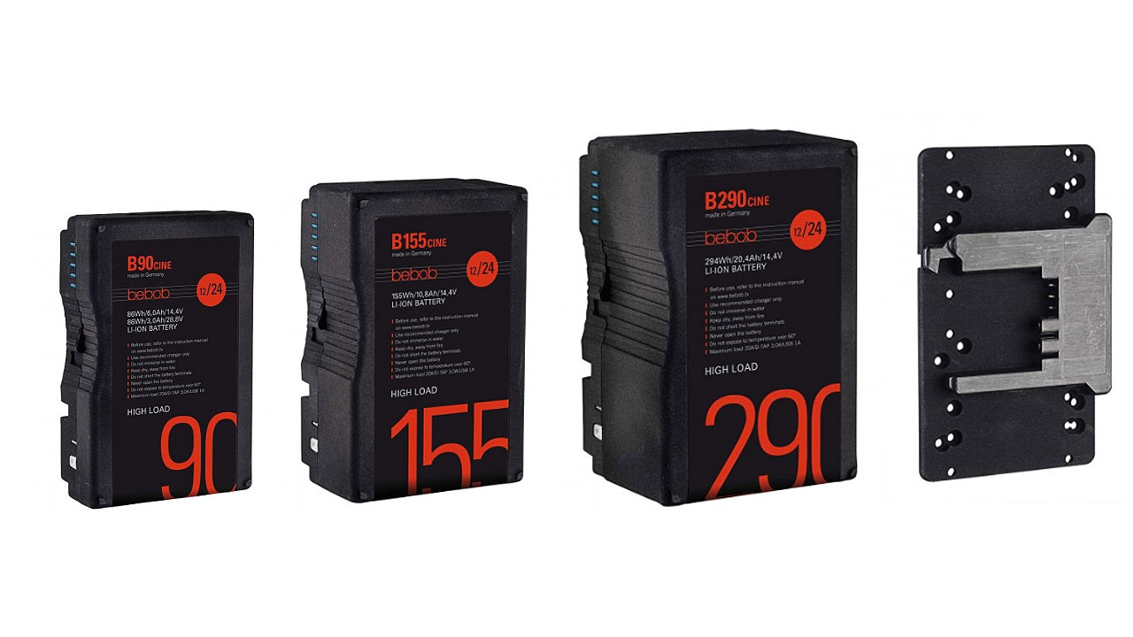 Auf der NAB zeigt Bebob bereits seine erste Serie von 12/24-Volt-fähigen Batterien mit passendem Zubehör. Diese sind auch schon auf der Herstellerseite eingestellt. Der teuerste ist der B290CINE mit 294Wh Kapazität für 795 Euro. Der B90CINE liefert etwa 86Wh und kostet 445 Euro. Es gibt auch eine B-Mount Hotswap-Variante des B90 namens B90CINEHS für 545 Euro. Eine B-Mount-Platte BMM-12 oder BMM-24 bekommt man für 95 Euro.