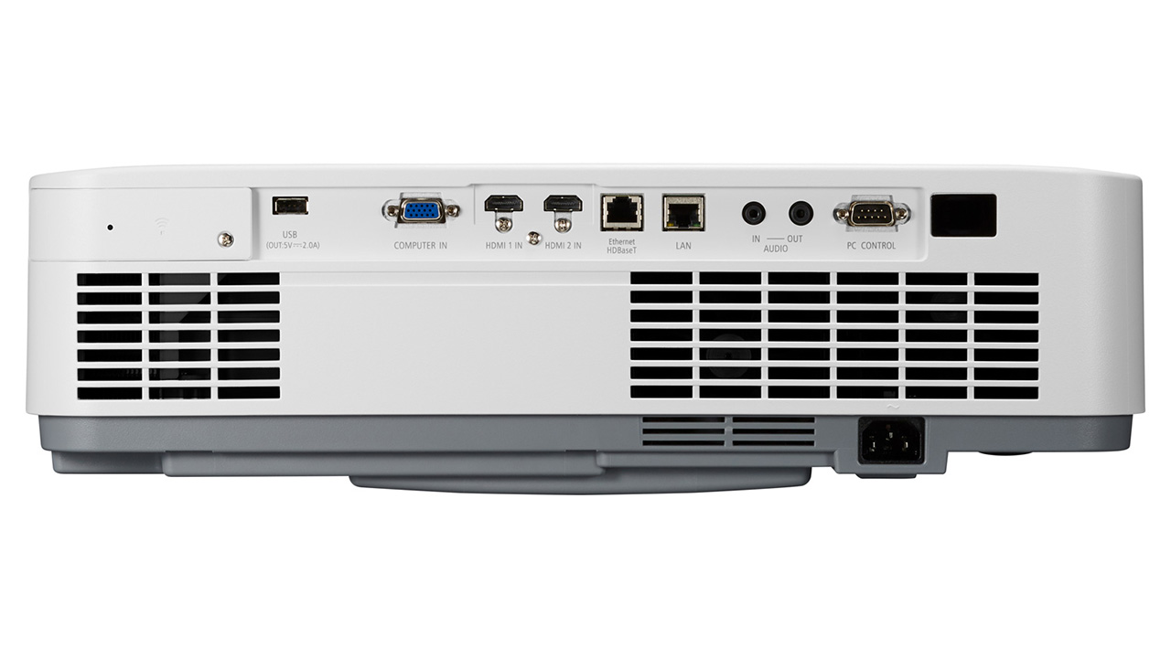 Die Anschlussleiste deckt VGA sowie HDBaseT und HDMI mit HDCP ab. Daneben gibt es noch eine LAN-Buchse sowie Stereo-Mini-Klinke und einmal USB. Will man eine WLAN-Verbindung, muss man diese optional (vermutlich via Dongle) nachrüsten. Der NEC beherrscht eine manuelle Trapezkorrektur für +/- 30 Grad vertikal wie horizontal. Außerdem zoomt er manuelle 1,6fach und auch der Fokus wird manuell gesteuert. Die integrierte MultiPresenter-Funktion erlaubt zudem eine kabellose Präsentationen und Bildschirmfreigabe.