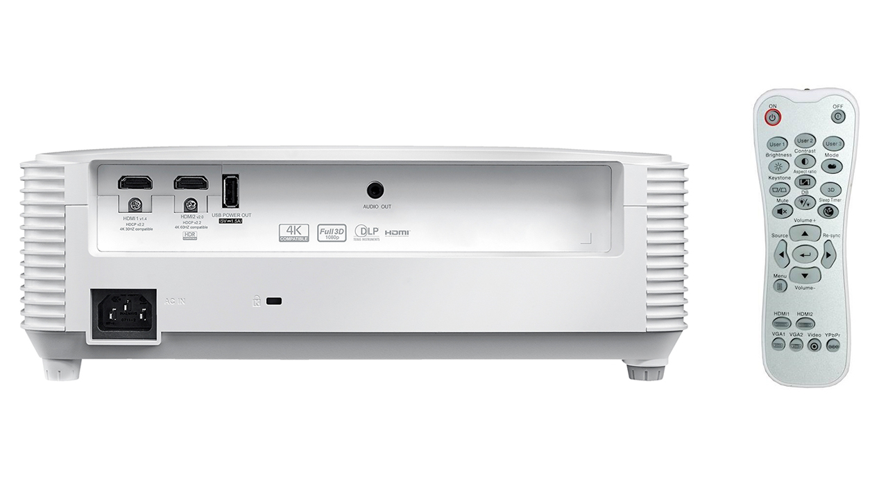 Anschlüsse stellt der Projektor für einmal HDMI 2.0 sowie einmal HDMI 1.4 bereit. Dazu gesellt sich eine 3,5-Millimeter-Audio-Buchse sowie ein USB-A-Power-Anschluss. Die maximale Lampenlebensdauer wird mit 150.000 Stunden für den dynamischen Lampen-Modus angegeben. Läuft der Projektor bei voller Helligkeit sind es laut technischen Daten 4000 Stunden.