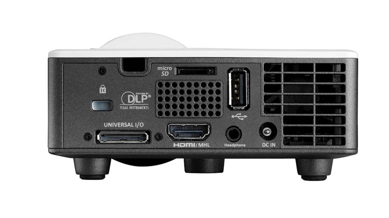 Ein Zoom-Objektiv hat der ML1050ST leider nicht. Kissenverzeichnungen sollen sich zumindest durch eine vertikale Trapezkorrektur für 40 Grad etwas ausgleichen lassen. Das Betriebsgeräusch soll nur 22 Dezibel betragen. Für welchen Modus das gilt, erwähnt Optoma nicht. Die Anschlussleiste stellt einmal HDMI 1.4a sowie VGA bereit. Per USB oder microSD-Karte darf man Video- und Fotomaterial sowie Office-Präsentationen direkt wiedergeben.