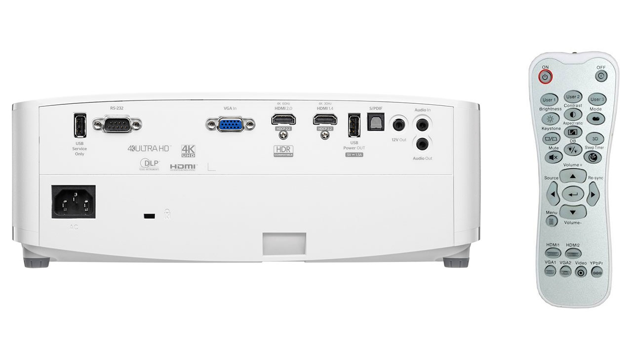 Die Lampenlebensdauer liegt zwischen 4000 und 15.000 Stunden, je nach gewähltem Lichtmodus. Die Anschlussleiste stellt einmal HDMI 2.0 und HDMI 1.4a bereit und kann zusätzlich mit einer VGA-Buchse dienen. Ferner gibt es einen Audio-Ein- und Ausgang für 3,5 Millimeter Klinke sowie digitales S/PDIF. Auch eine Steuerungsbuchse sowie ein USB-A-Port ist mit dabei. Ob man man über letzteren Video- und Foto-Dateien direkt abspielen kann, wird leider nicht klar. Man darf aber einen Smart-TV-Stick für Video-on-Demand-Inhalte wie Google Chromecast oder Amazon Fire TV anstecken. Für die direkte Tonwiedergabe ist ein 10-Watt-Lautsprecher integriert. Die Betriebslautstärke soll bei 26 Dezibel liegen.