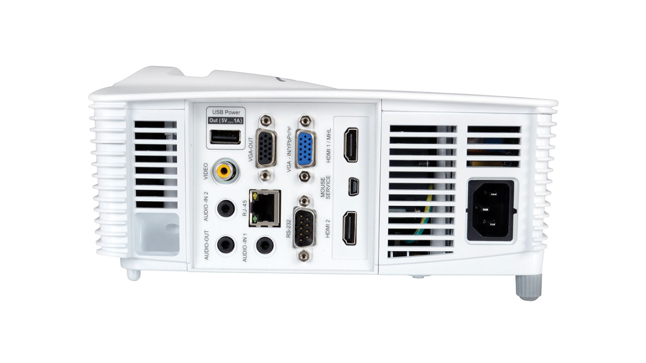Die Anschlussleiste liefert zweimal HDMI mit MHL-Support sowie VGA, Composite, zweimal Audio-Eingang und einmal Audio-Ausgang plus VGA-Out. Über den integrierten 10 Watt-Lautsprecher gibt der Optoma Ton auch direkt aus. Die integrierte Lampe des DLP-Projektors soll im hellen Lichtmodus für 3000 Betriebsstunden reichen. Im Eco-Modus lässt sich die Dauer mit 7000 Stunden mehr als verdoppeln. Der WU416 soll im Spar-Modus mit einer Betriebslautstärke von 32 Dezibel tönen, was bereits recht laut ist. Im hellen Lichtmodus dürfte er dann nochmals ein paar Dezibel zulegen. Der Projektor kann auch 3D, wobei man eine 3D-Brille optional erwerben muss.
