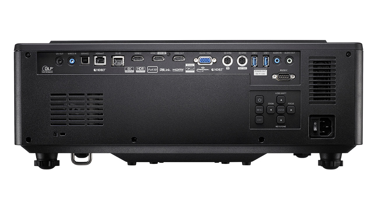 Der Beamer bietet ein festes, telezentrisches Objektivdesign mit voll motorisiertem Lens-Shift für vertikal +/- 50 Prozent und horizontal +/-15 Prozent sowie einen 1,26-fachem motorisiertem Zoom und Fokus. Das Projektionsverhältnis liegt liegt 0,75-0-0,95:1 – maximal kann der Optoma ein 300 Zoll großes Bild aufziehen, wobei der Projektionsabstand 0,81m – 6,13m beträgt. Er bietet zudem den 360-Grad- und Porträtmodus-Betrieb, integriertes Edge-Blending, Warping sowie eine Vier-Ecken-Korrektur für +/- 30 Grad in der Vertikalen und Horizontalen.
