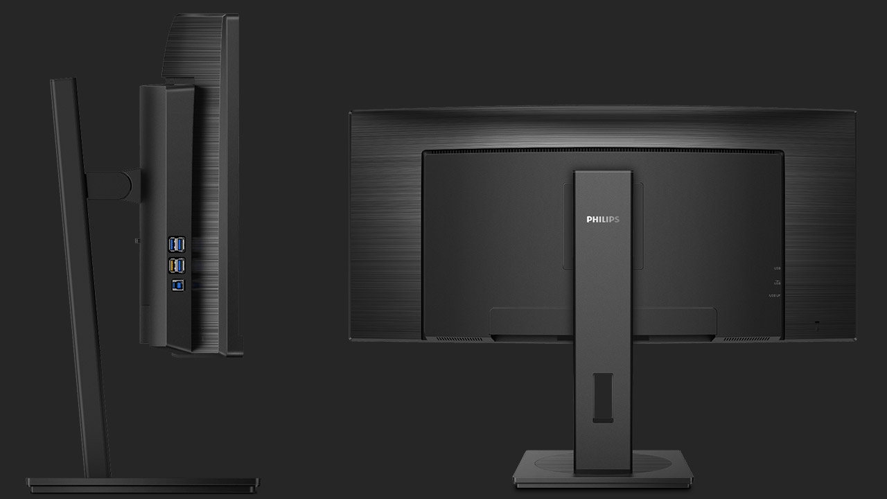 Das integrierte VA-Panel liefert demnach native 3440 x 1440 Pixel auf einer 86,36 Zentimeter großen Bilddiagonale. Philips gibt eine Pixeldichte von 110 ppi an nennt eine Helligkeit von 300 cd/m² für das 8-Bit-Display im 21:9-Format. Neben der Side-by-Side-Option erlaubt der Monitor auch das Einrichten einer Splitscreen-Ansicht worüber sich das Bild von zwei verschiedenen Rechnern nebeneinander anzeigen lässt. Vereinfacht wird die Steuerung dabei durch den integrierten MultiClient KVM-Switch, über den man beide Rechner mit nur einer Tastatur und Maus steuern kann. Mittels Adaptivs-Sync-Unterstützung und einer relativ flotten Panel-Schaltzeit von 5 Millisekunden (GtG) soll der Philips dann auch mal fürs Spielen taugen.