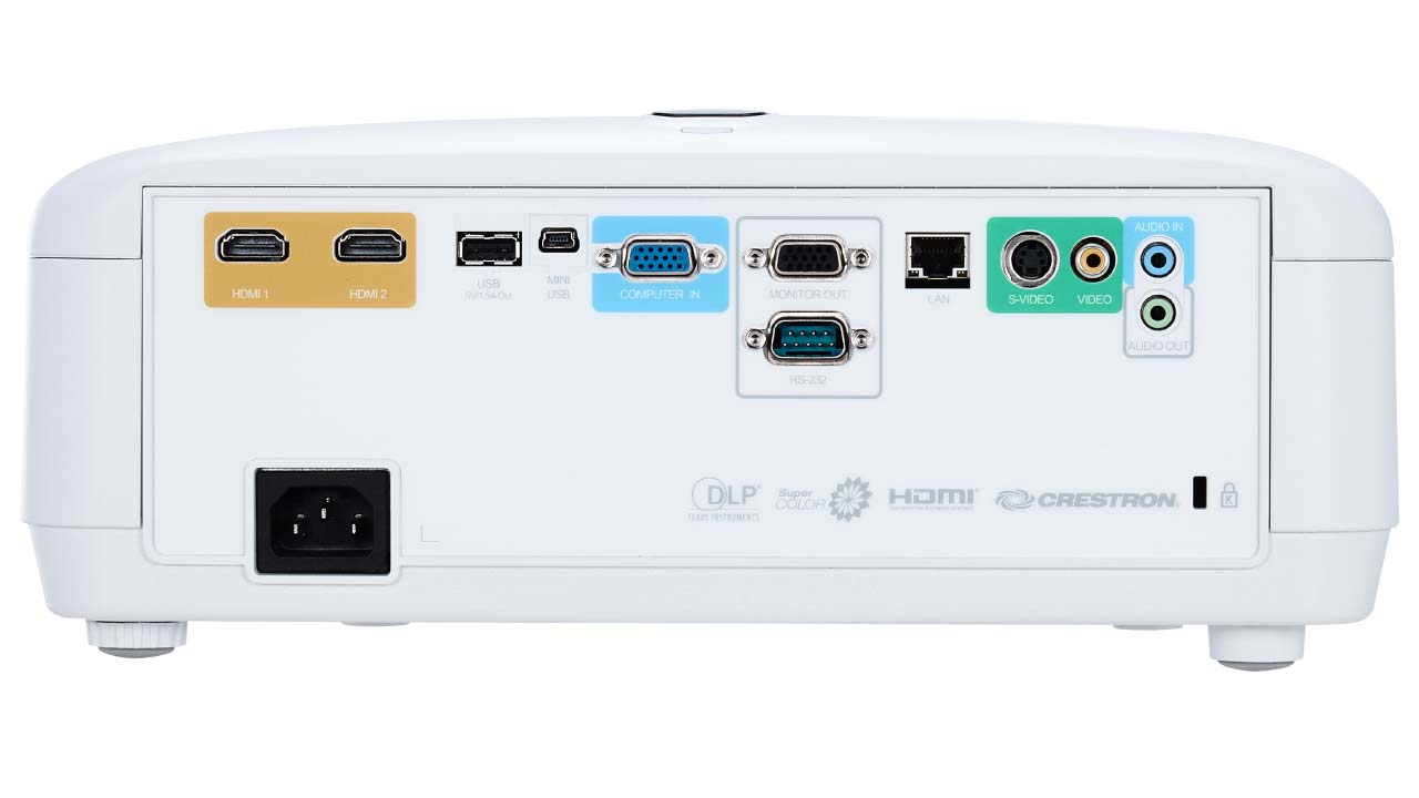 Die Anschlussleiste stellt zweimal HDMI sowie VGA, Composite Video, S-Video, USB, Mini-USB und eine Audio-Buchse bereit. Ton wird auch direkt über einen 10-Watt-Lautsprecher ausgegeben. Die Lampenlebensdauer soll im normalen Lichtmodus bei 4000 Stunden und im Sparmodus bei 15000 Stunden liegen.