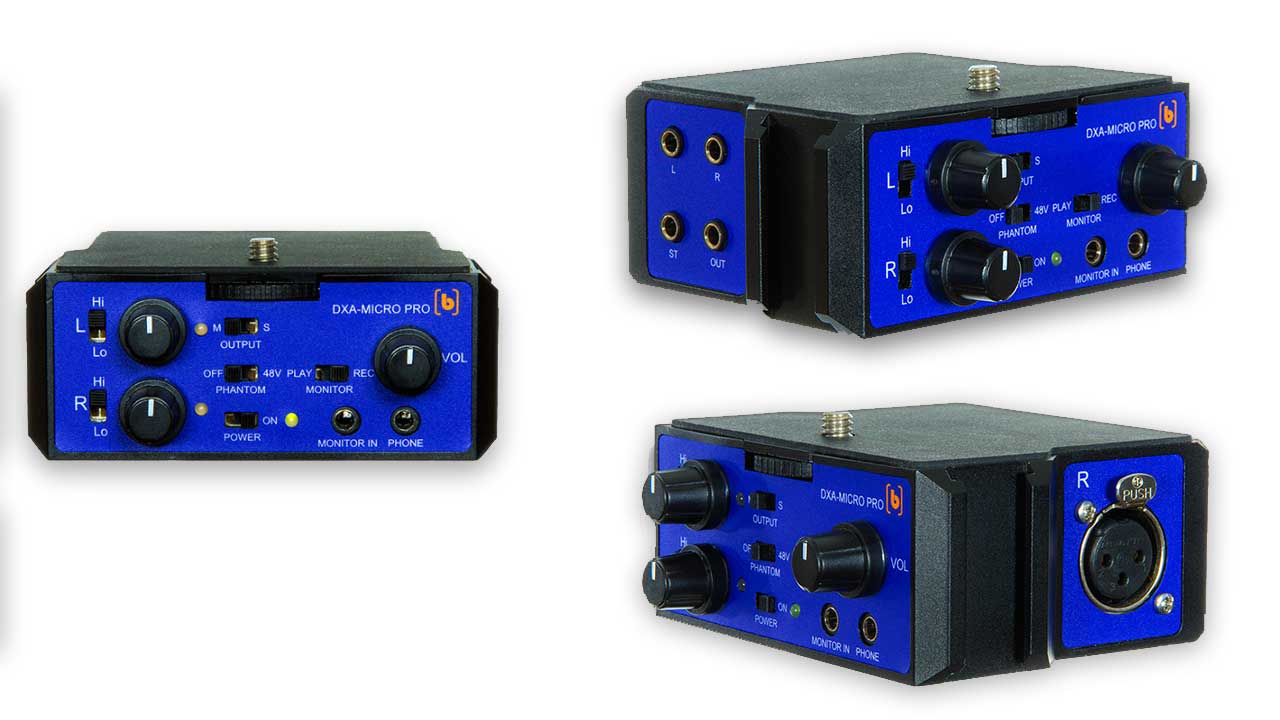 Der Beachtek DXA-Micro Pro bietet seitlich Anschlüsse für 3,5 Millimeter Mono-Eingänge sowie einen XLR-Anschluss mit Phantom-Speisung.