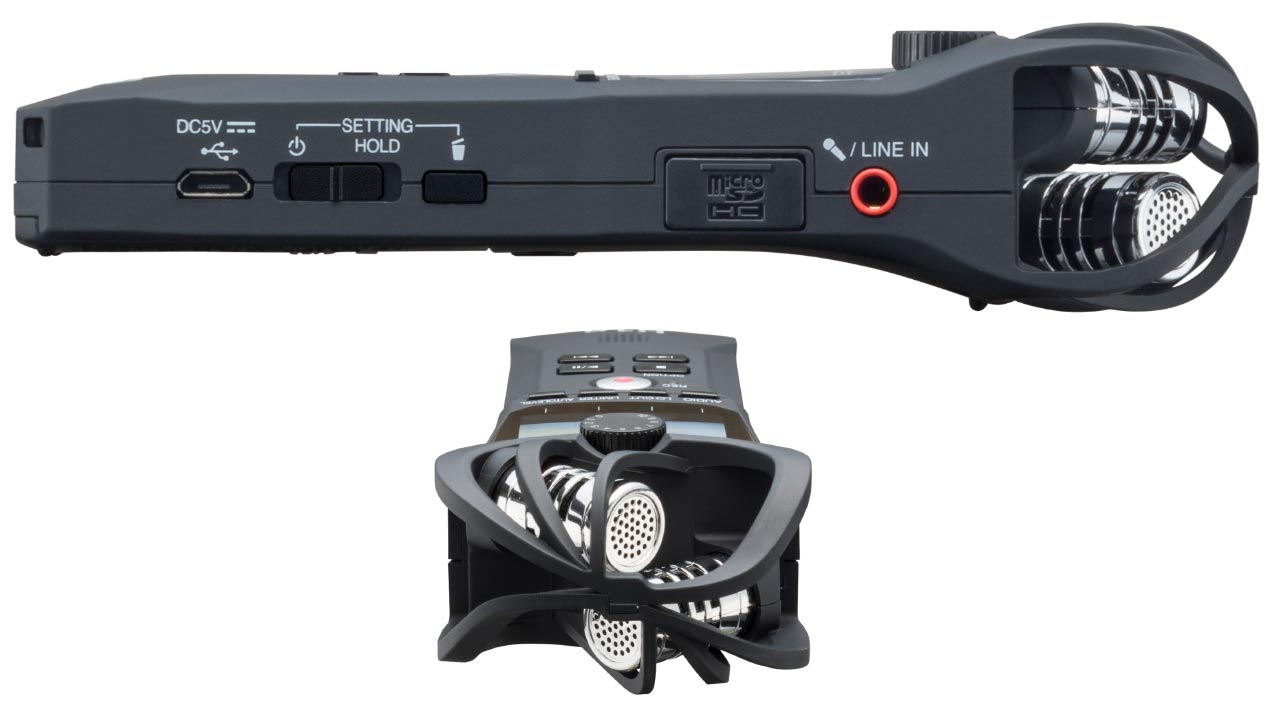 Der H1n verfügt nach wie vor über ein integriertes XY-Stereomikro mit jetzt neu entwickelten Kapseln samt neu konstruierten Schutzbügeln und nimmt wahlweise mit 44,1, 48 oder 96 Kilohertz mit 16 oder 24 Bit im Wave-Format auf. Auch MP3-Sound ist wie beim Vorgänger möglich. Über einen Miniklinkeneingang lassen sich auch externe Stereomikros (sogar mit 2,5-Volt-Plug-in-Power) oder Line-Quellen anschließen.