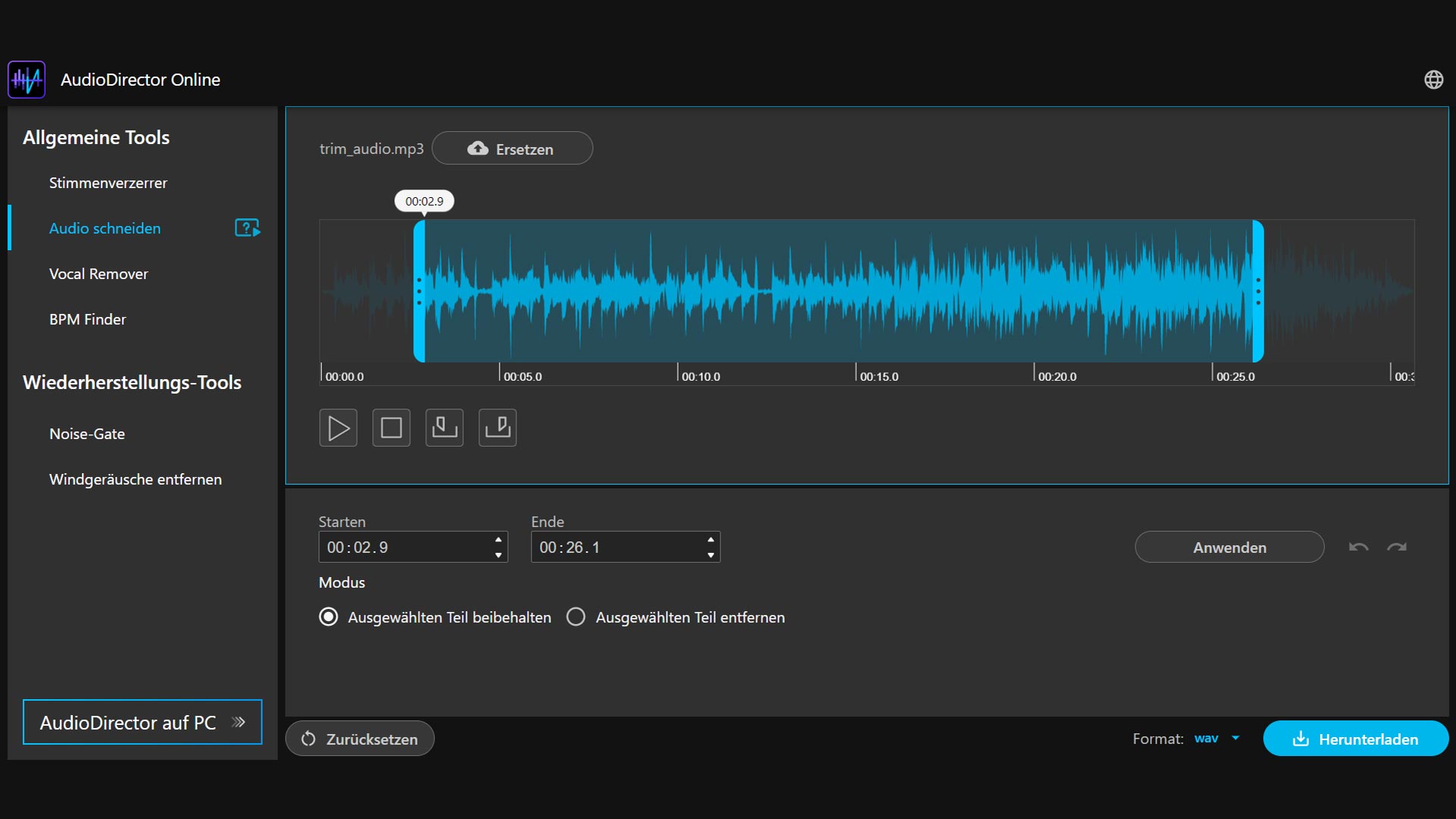 Mit dem AudioDirector Online lassen sich Audiotracks auch trimmen und schneiden.