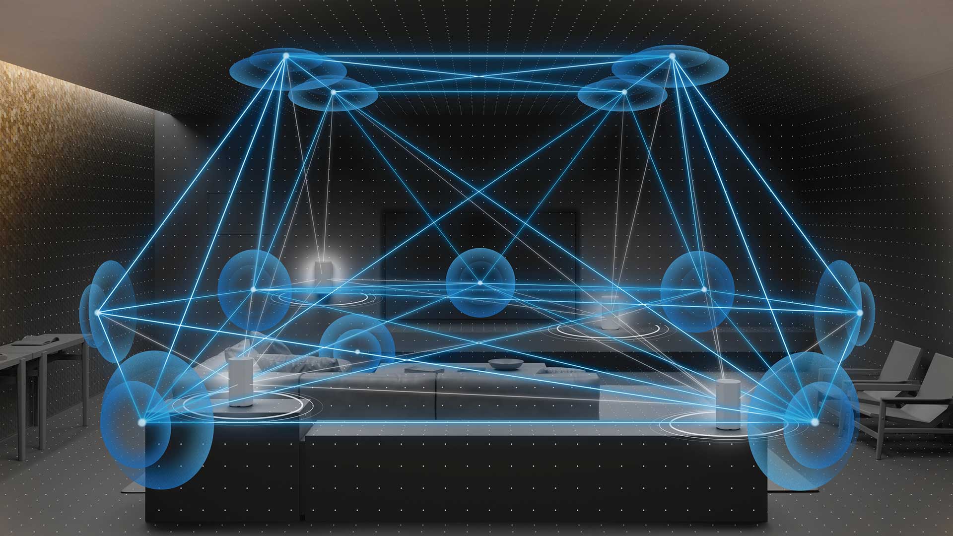 Die vier Lautsrecher des Sony HT-A9 sollen durch ihre innovative 360-Grad-Spatial-Sound-Technologie den Raum so nutzen können, dass durch Abprallen des Schalls der Eindruck eines 12-Lautsprecher-Systems entsteht.
