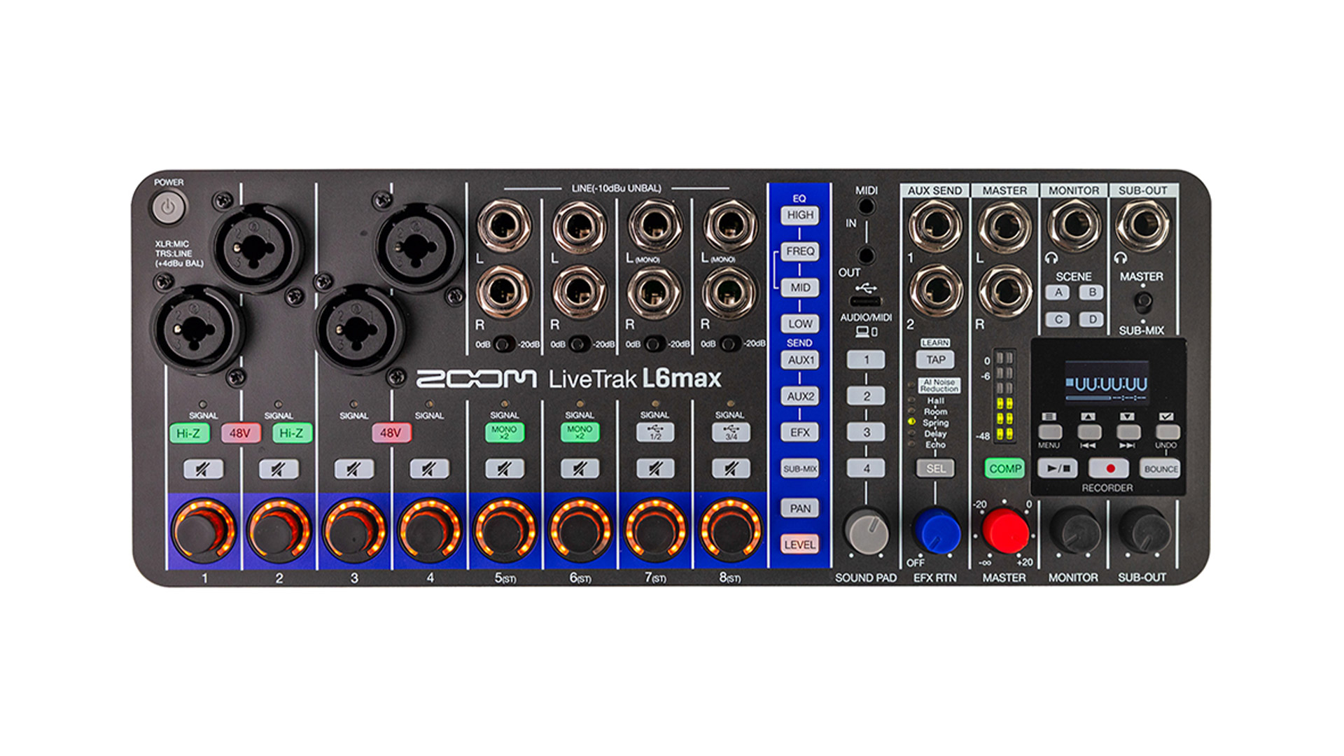 Vom L6 ist der L6Max auf den ersten Blick durch das neue OLED-Display und die zwei zusätzlichen XLR/Klinke-Buchsen unterscheidbar.
