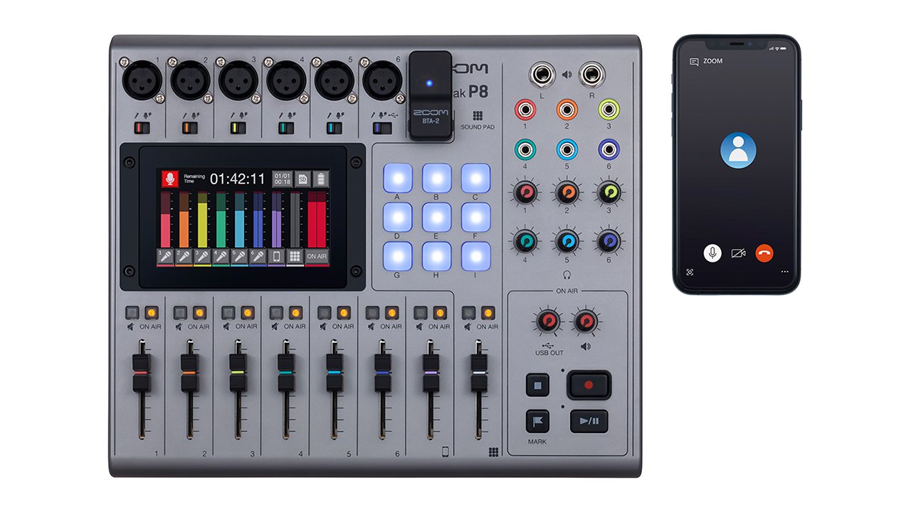 Der P8 bietet sechs Mikrofoneingänge und setzt auf neu entwickelte Mikrofonverstärker, die bis zu 70 Dezibel Verstärkung liefern und auch hochklassige Mikrofone von Zoom mit rauscharmem Klang versorgen sollen. Um den Sound feinzujustieren, bringt der PodTrak P8 einen Klangregler, Kompressor, Limiter und Deesser mit. Dazu gesellen sich sechs Kopfhörerausgänge mit individueller Laustärkeregelung. Gerade in Corona-Zeiten praktisch: Kann ein Teilnehmer nicht „physisch“ anwesend sein, lässt er sich per Smartphone oder Laptop via USB zuschalten. Das Smartphone lässt sich dabei per TRRS-Kabel oder mit einem neuen BTA-2-Bluetooth-Adapter kabellos mit dem PodTrak P8 verbinden. Dabei sorgt die integrierte Mix-Minus-Funktion für eine automatische Feedbackunterdrückung bei über USB oder Smartphone eingespeisten Anrufen.