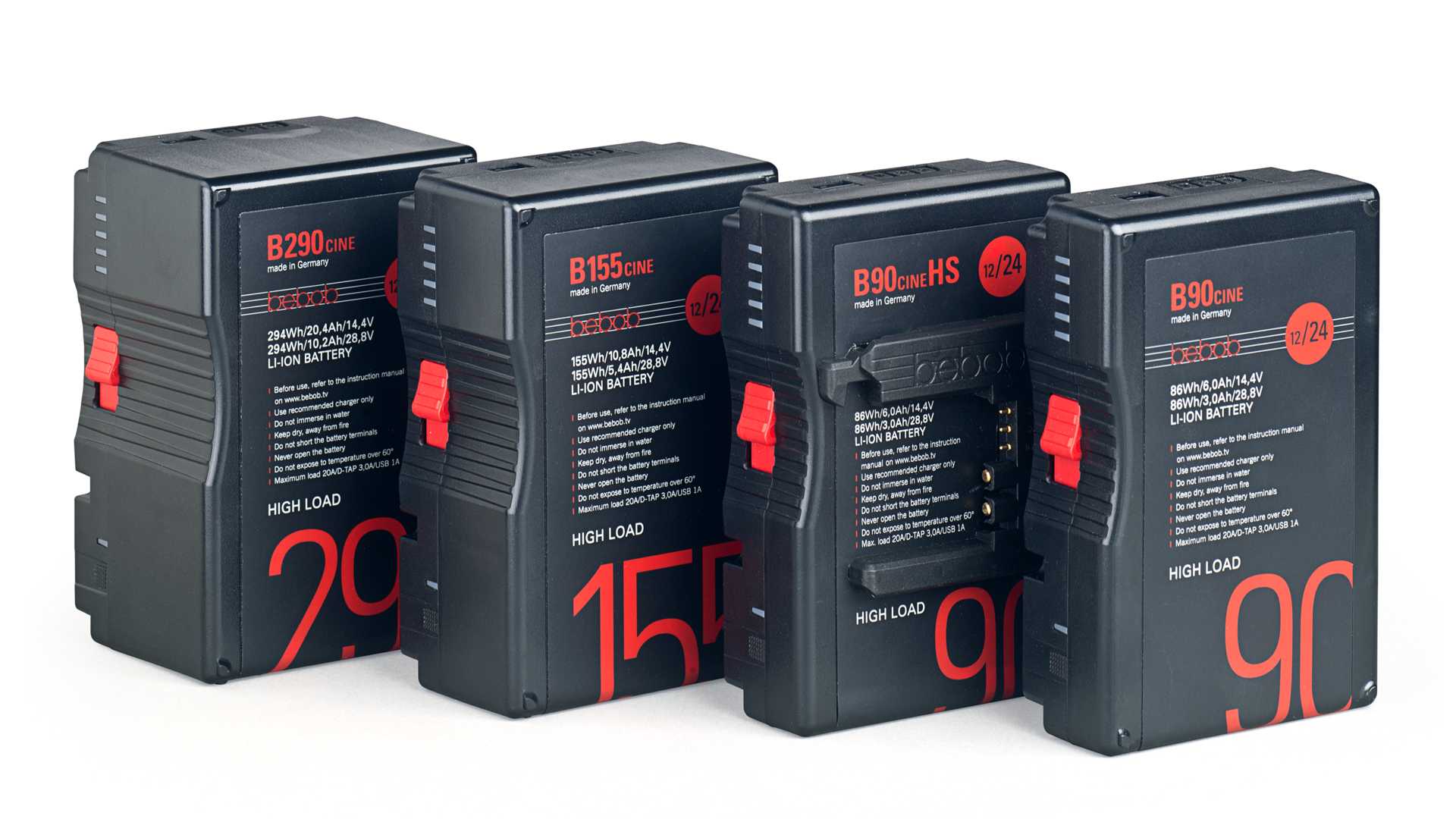 Ab sofort sind vier verschiedene B-Mount Akkus von Bebob verfügbar: Das Portfolio umfasst den B90cine mit 86Wh Kapazität, den B155cine mit 156Wh sowie den B290cine mit 285Wh. Als viertes Modell gibt es den B-Mount Hot Swap - B90cineHS. Dieser Akku lässt sich mit anderen B-Mount Akkus in Reihe schalten. So kann man einerseits die Gesamtkapazität erhöhen und andererseits beim Austausch von Akkus während des Drehs eine unterbrechungsfreie Stromversorgung sicherstellen. Die B-Mount Schnittstelle liefert dabei auch bei hintereinandergeschalteten Akkus Informationen über Laufzeit und Ladezeit. Die Akkus unterstützen alle Multi-Voltage und bieten damit sowohl eine Spannung von 24 Volt, als auch die klassische von 12 Volt.