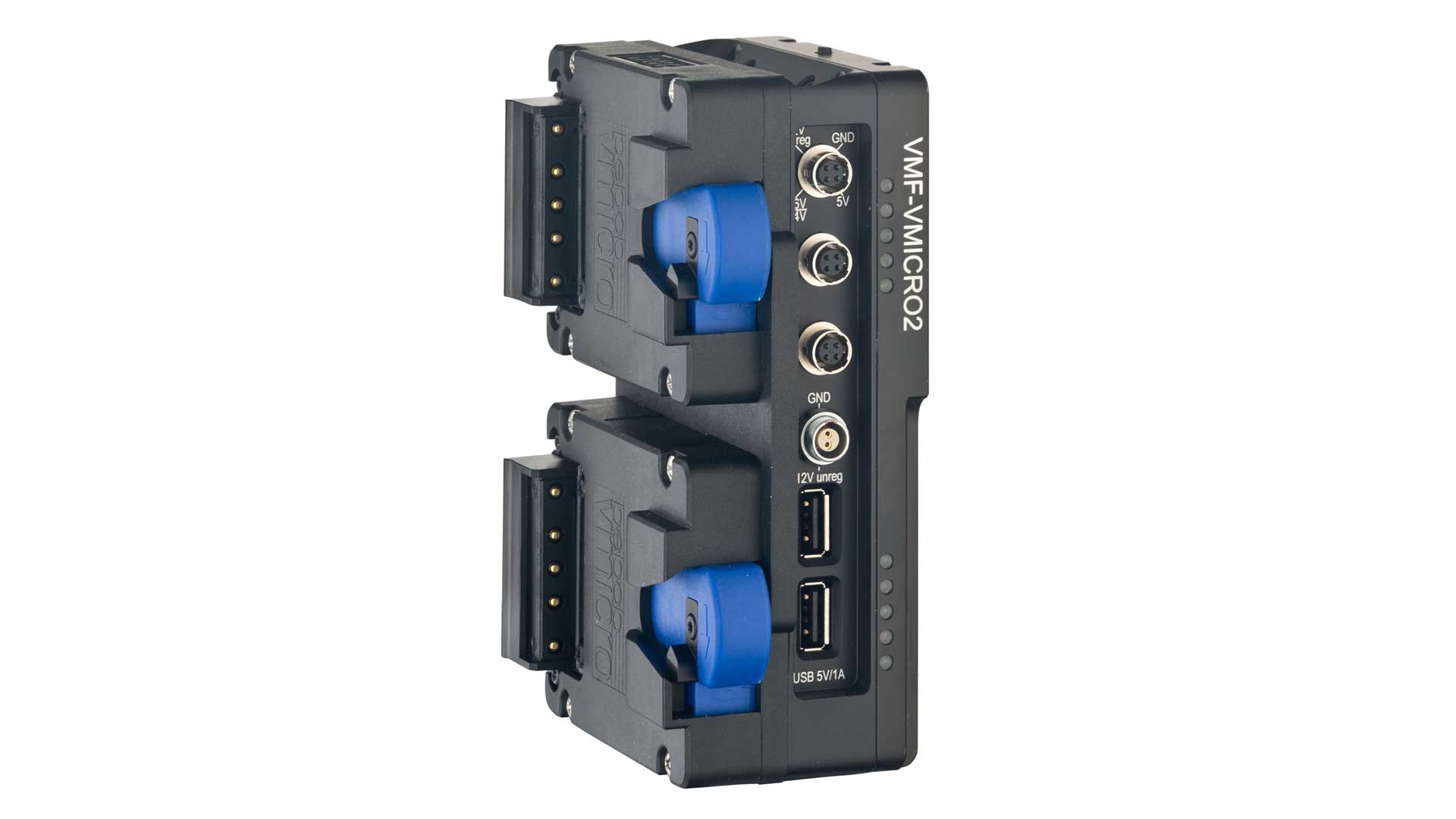 Spezifikationen Modell: Coco-Vmicro2 und Coco-Amicro2Mount: V-Mount und A-Mount Kompatibel mit 12V Vmicro-Akkus bzw. 12V Amicro-Akkus Max. Stromaufnahme: 16A Hotswap-FunktionAusgänge: - 3 x Twist D-Tap: 13V reg / max. 5A - 2 x USB (A): 5V / max. 1A - 1 x Lemo 2p: 13V reg / max. 1A - 3 x Hirose 4p: 13V; 5V; 7,6V/8,4V ( umschaltbar ) / max 1AEingänge: - 1 x Twist D-Tap DC-In: 14,4V unreg. max. 5A 5-stufiges LED-Display zur Anzeige des Ladestatus auf beiden Seiten