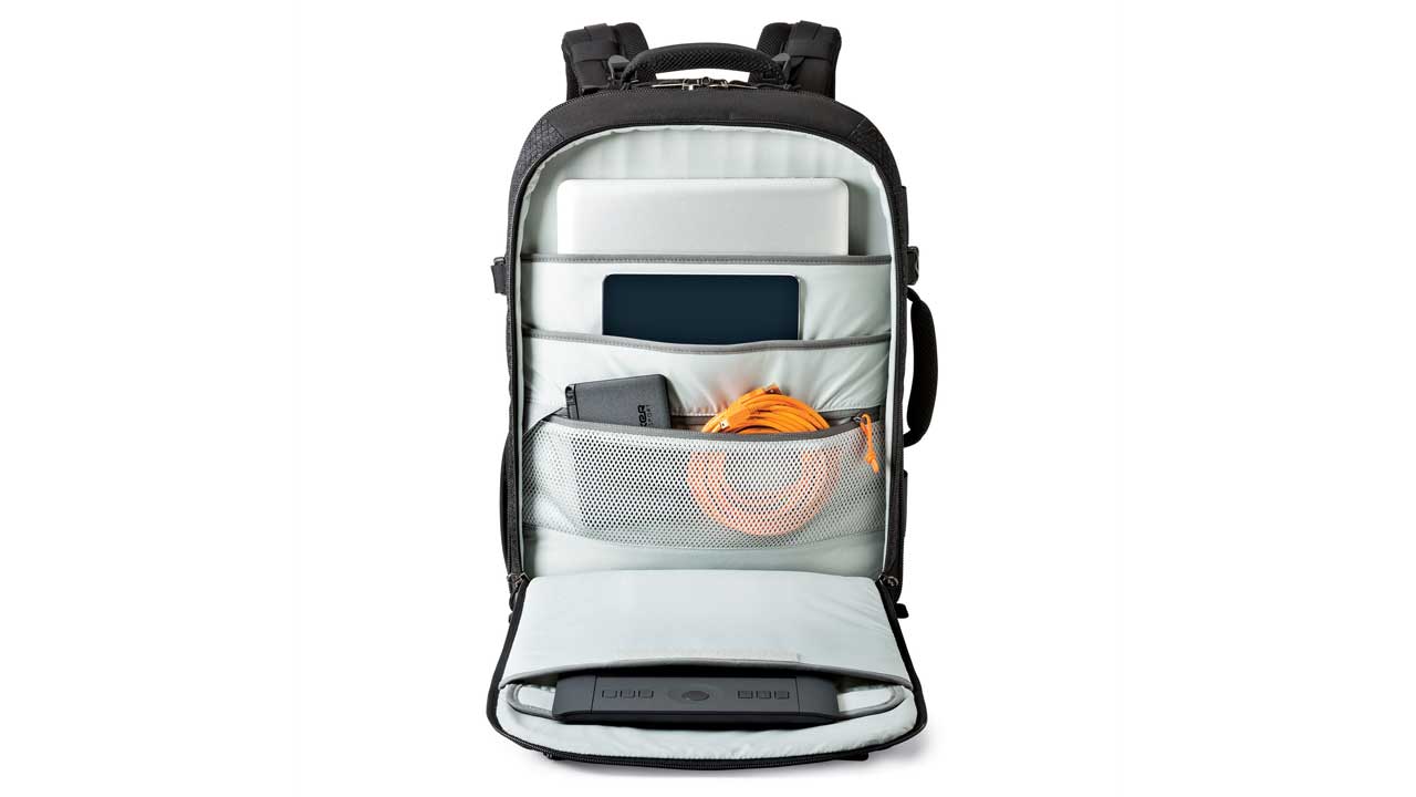 Die Fronttaschen ist für Dokumente und Reiseunterlagen gedacht. Es gibt elastische Seitentaschen, ein anpassbares Tragesystem mit abnehmbarem Hüftgurt und eine verstaubare Stativhalterung. Über Schlaufen kann man die Kapazität erweitern, ein Regenschutz sorgt dafür, dass man den Rucksack auch auf härteren Touren einsetzen kann.