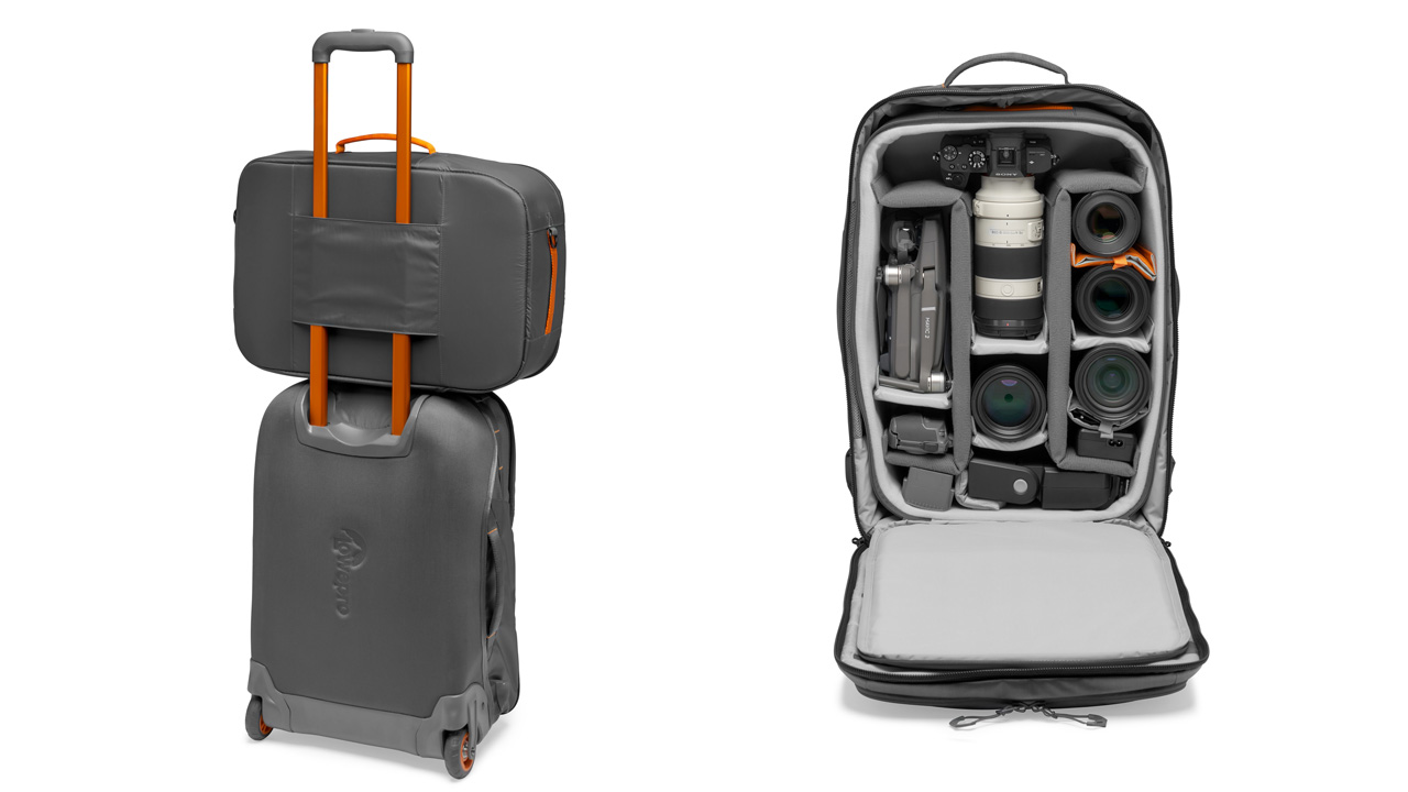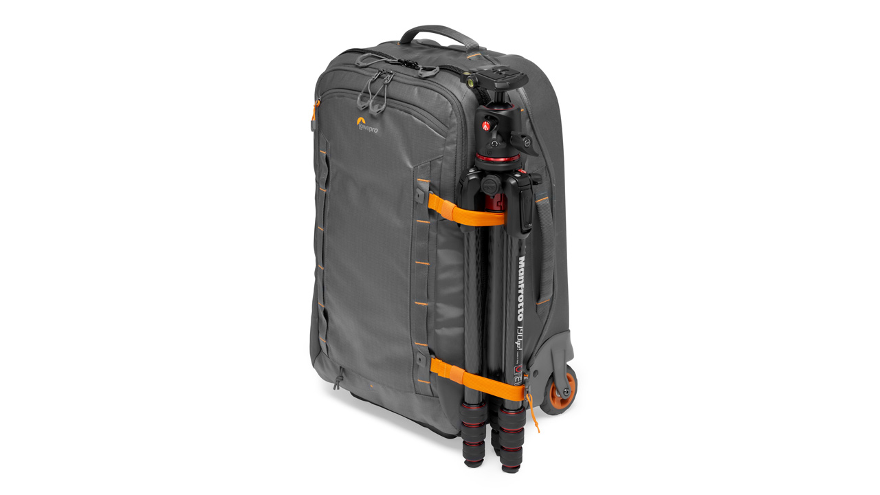 Das entnehmbare Kamera-Inlay kann optional per Schlaufe am Griff befestigt werden. Der Rollkoffer ist dadurch auch parallel als Kamera- oder Reisetrolley nutzbar. Neben der Kamera sollen fünf weiteren Objektive und Blitzgerät beziehungsweise Audioequipment oder eben weniger Objektive und dafür ein Camcorder Platz finden. Dazu passt noch ein 15-Zoll-Laptop und ein 10-Zoll-Tablet, wobei die äußere Reißverschlusstasche am Laptop-/Tablet-Fach den Zugriff darauf erleichtert. Schnellen Zugriff gibt es zudem auf das Smartphone und Brieftasche. Zwei separat entnehmbare Quick Straps an der Vorderseite ermöglichen den Transport eines Stativs oder weiteren Zubehöres.