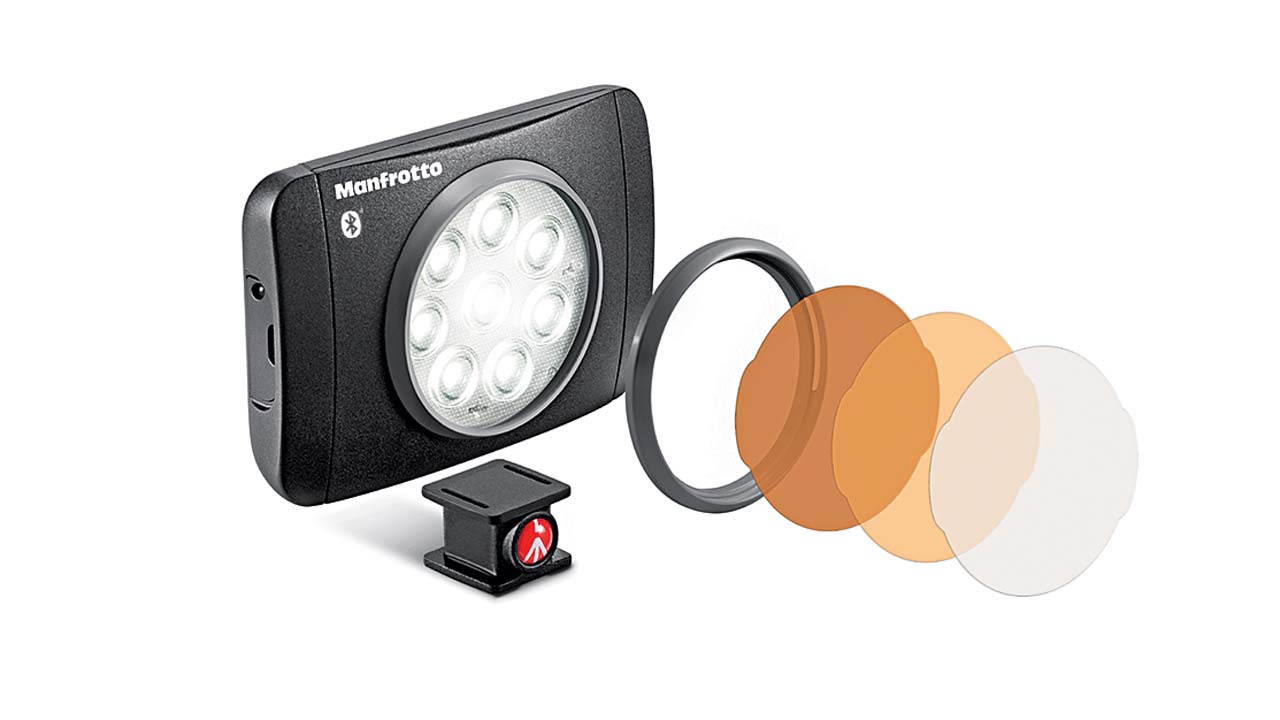 Damit sich die Leichtfarbe einstellen lässt liefert die Lumimuse 8 BT einen Filter-Schnappverschluss für die vier mitgelieferten Filter. Neben drei Farbfilter liefert Manfrotto einen Diffusor in einer praktischen Dose. Für weitere kreative Anwendungen sind optional alternative Filter-Sets und Farben erhältlich. Manfrotto liefert zudem einen Kameraschuh und hat ein Standard-Stativgewinde integriert.