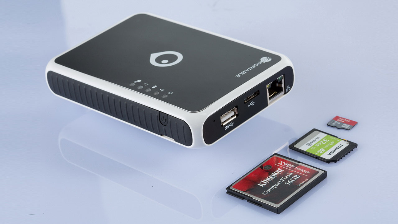 Die Mportable II lässt Inhalte von Speicherkarten direkt kopieren, kann eine WLAN-Verbindung aufbauen, kommuniziert mit Smartphone/Tablet und dient auch als Netzerkspeicher.