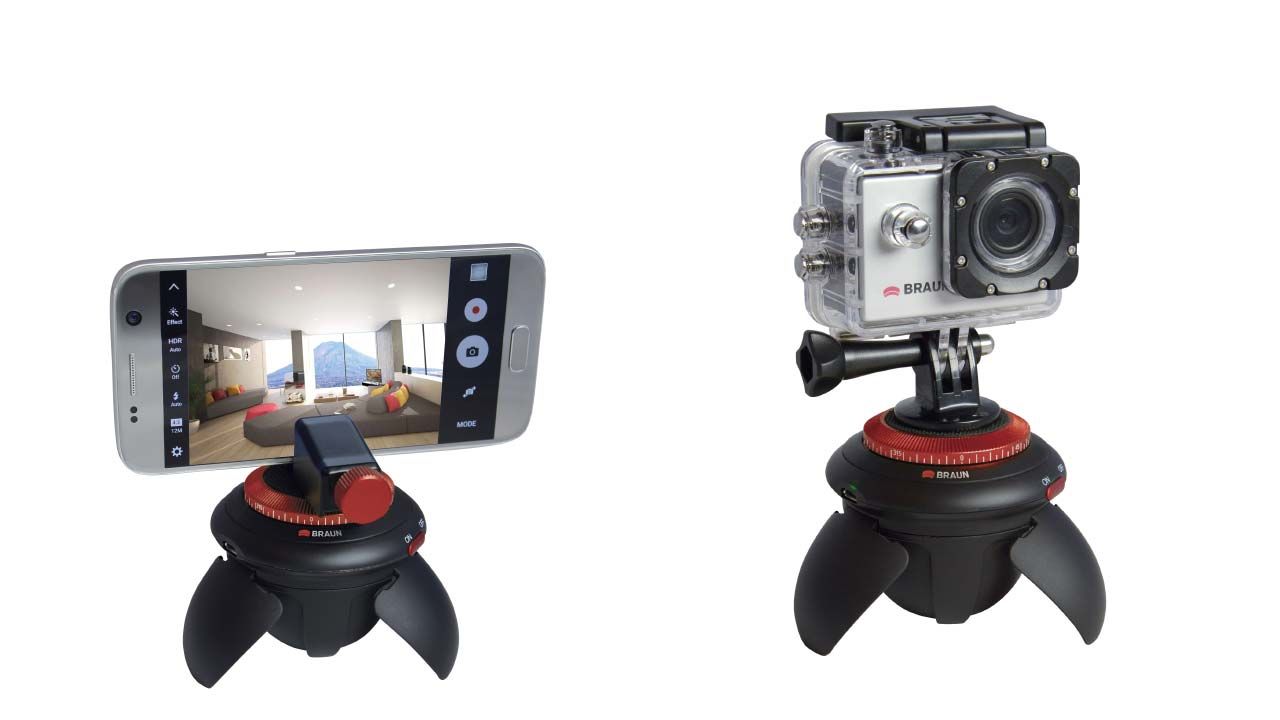 Braun bringt einen motorisierten Stativkopf für Actioncams und Kompaktkameras, der sich um 360-Grad drehen kann und somit Panorama-Aufnahmen erlaubt.
