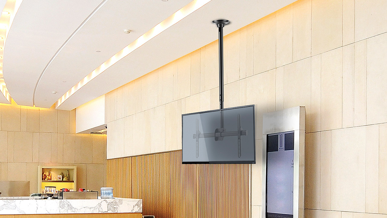Das Display lässt sich nach der Montage an der Halterung auch ohne Werkzeug um -25 Grad nach unten neigen und um 360 Grad schwenken. Die neue Reflecta-Deckenhalterung verfügt über einen Kabelführungskanal, um Kabelsalat zu verhindern.