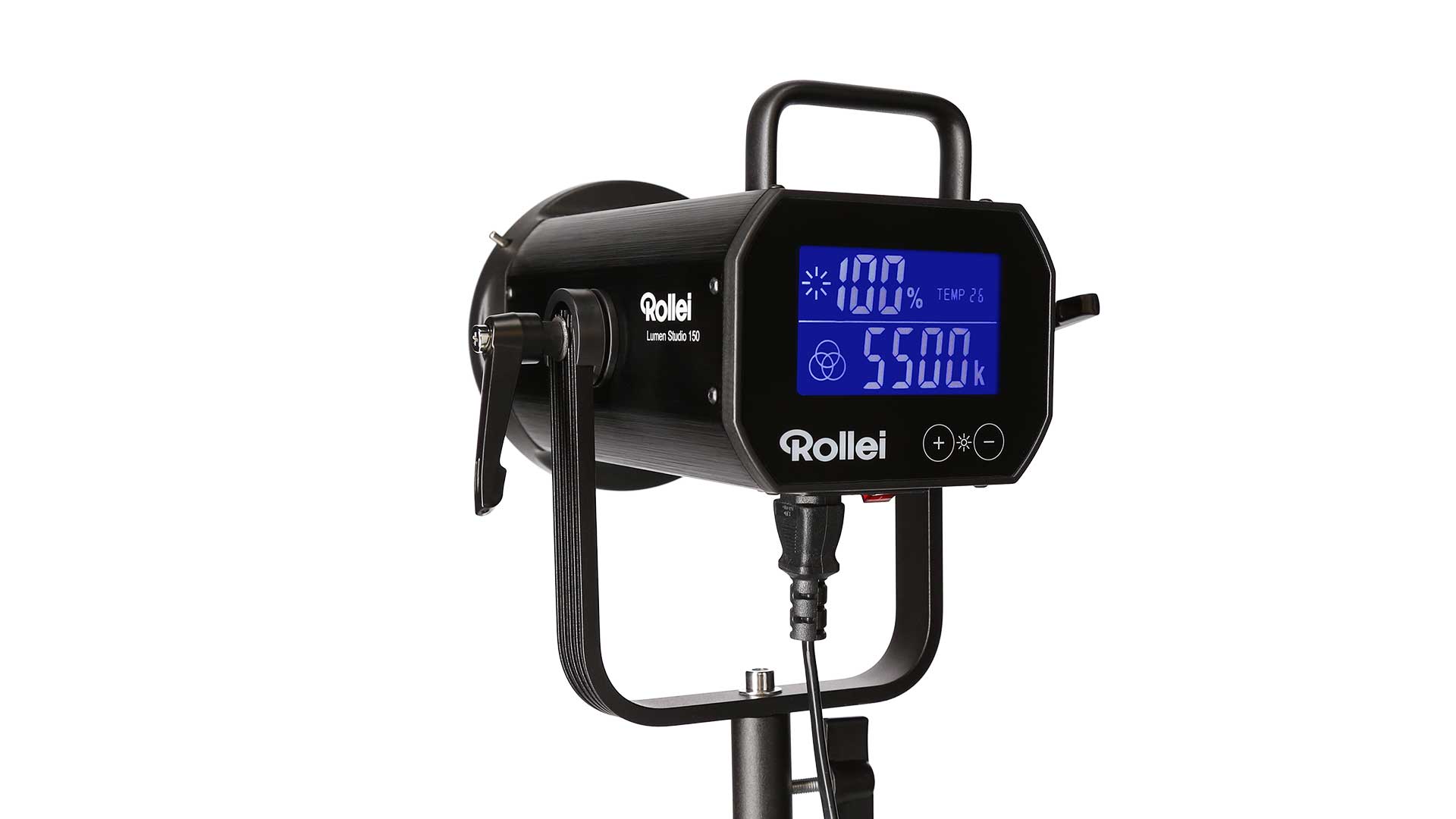 Das 150-Watt-starke LED-Dauerlicht Lumen Studio 150 richtet sich an Profis wie Einsteiger und arbeitet mit einer Farbtemperatur von 5.500 Kelvin und einer Beleuchtungsstärke von 20.768 Lux (gemessen auf 0,5 Metern ohne Reflektor) respektive 135.370 Lux (gemessen auf 0,5 Metern mit einem 70°-Reflektor) und soll so für flimmerfreies Licht sorgen. Es kommt laut Rollei auf einen CRI von über 95 und TLCI von über 96 und will so stets natürliches Licht auch für die Arbeit im Studio garantieren. Über die Touch-Sensor-Tasten oder die Smartphone-App “Rollei Lumen” lässt sich das Dauerlicht dabei in 1-Prozent-Schritten stufenlos zwischen 0 und 100 Prozent in der Beleuchtungsintensität anpassen. Eine stetige Kontrolle der Lichtintensität, sowie der Lampentemperatur ist über das OLED-Display machbar.
