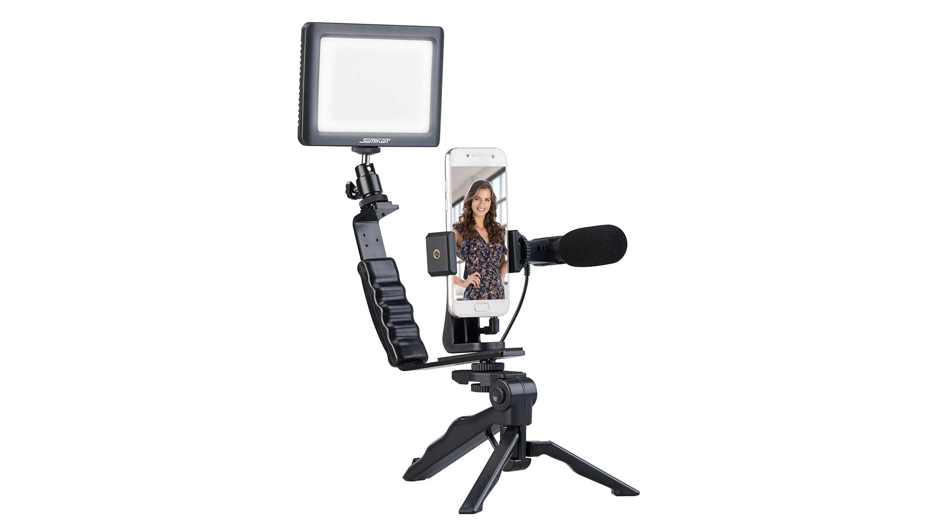 Das Somikon Vlogging-Set (ZX-5065) kommt mit Leuchte, Mikrofon, Mini-Stativ und Klemm-Halterung, um die Videoaufnahme mit dem Smartphone zu verbessern.
