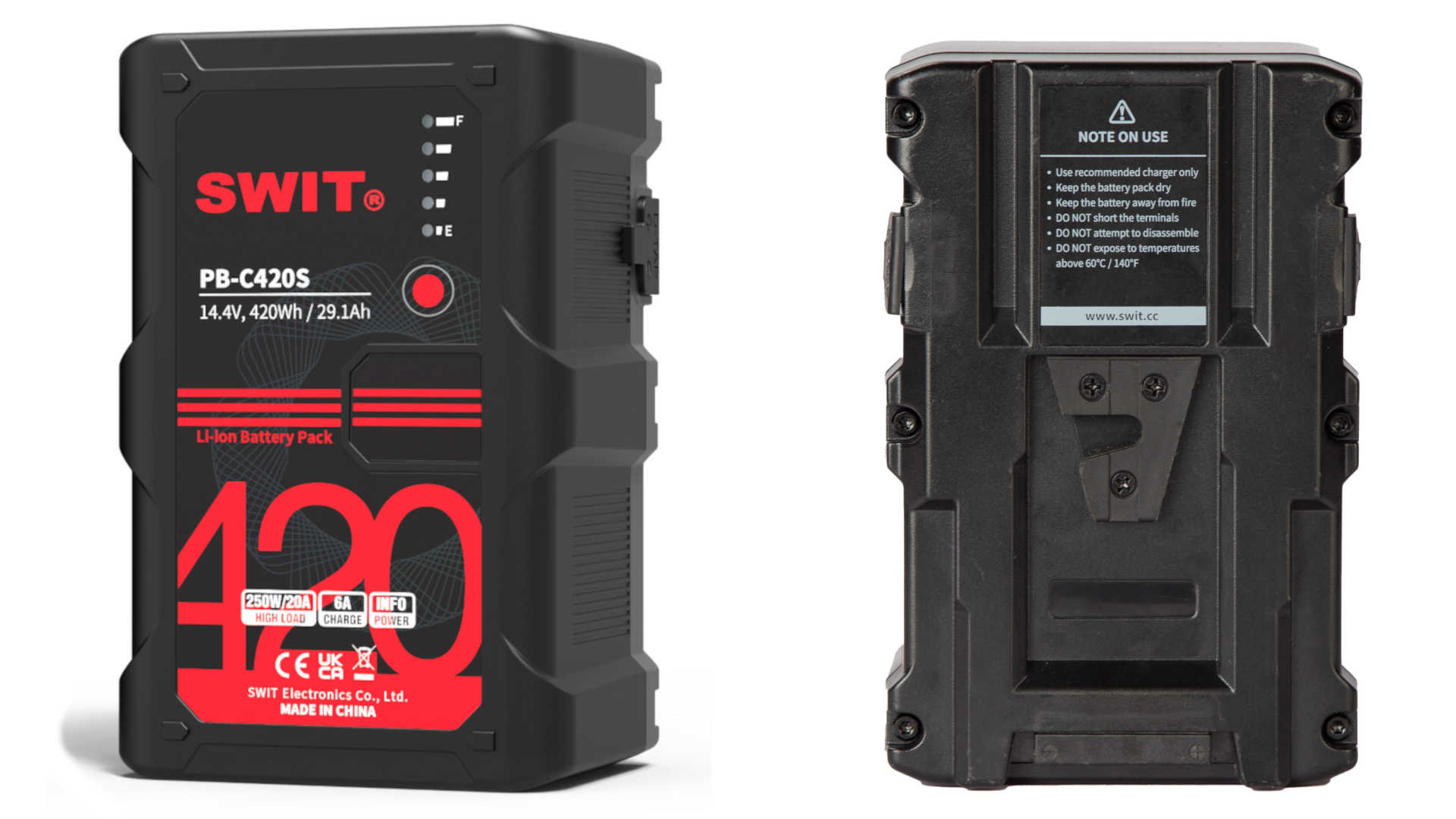 Der Swit PB-C420S ist bislang nur mit V-Mount-Option gelistet. Ob es der Hersteller auch andere Optionen, etwa für Gold- oder B-Mount plant, wird auf der Produktseite nicht ersichtlich. Auch einen Preis oder ein Erscheinungsdatum für den neuen PB-C420S lässt sich dort noch nicht entnehmen. Der Swit PB-C420S kommt auf von Abmessungen von 15,5 x 10,1 x 8,0 Zentimeter und wiegt satte 2,07 Kilogramm.