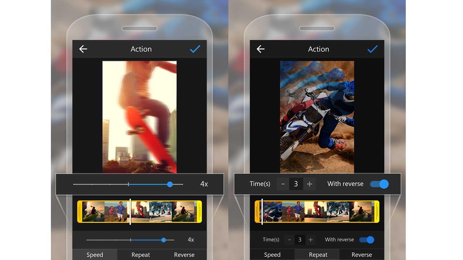 Mit der App für Smartphones und Tablets kann man Videos aufnehmen und sofort zuschneiden. Es lassen sich Helligkeit, Kontrast und Sättigung beeinflussen, Szenen verlagsamen oder beschleunigen beziehungsweise auch Rückwärts laufen. Allerdings kann man immer nur einen Clip bearbeiten und nicht mehrere aneinanderfügen. Damit es dennoch einen Film wird gibt es eine Titelfunktion für Vor- und Abspann und einen Audiomischer mit dem sich Hintergrundmusik hinzufügen lässt. Am Ende kann man das Video berechnen, so dass es sich direkt in soziale Netzwerke laden lässt.