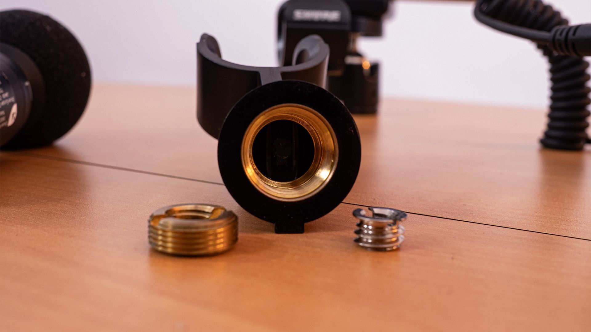 Mit 2,8 x 8,9 x 2,8 Zentimetern ist das in schwarz gehaltene MoveMic 88+ sehr kompakt. Die Kapseln sitzen geschützt im Metallgehäuse, ein aufziehbarer Poppschutz soll Plosivlaute mindern. Bis auf die Anschalttaste sind keine Bedienelemente am Mikrofon selbst, dafür sind mit 3,5mm-Klinkenbuchse und USB-C-Anschluss zwei Schnittstellen mit an Bord, letztere dient neben dem Aufladen des internen Akkus auch der Verbindung mit einem Computer. Zwei Status-LEDs geben Auskunft über Verbindung und Akku-Ladungszustand. Shure legt jeweils eine Klemme zur Montage auf Kamera-Zubehörschuhen respektive Stativen bei. Die Stativklemme besitzt ein 5/8-Zoll-Gewinde, ein Reduziergewinde auf 3/8-Zoll liegt bei. Zur Verwendung mit Stativen mit 1/4-Zoll-Gewinde braucht man jedoch einen weiteren, optionalen Adapter.